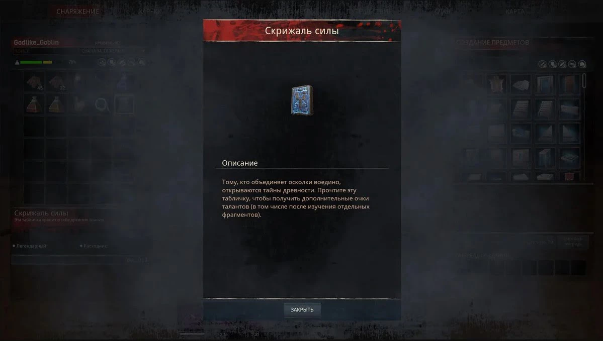 Еще одним возможным талантом станет Скрижаль Силы. Она делается из 5 Осколков Силы и тратится на получение 60 очков талантов.