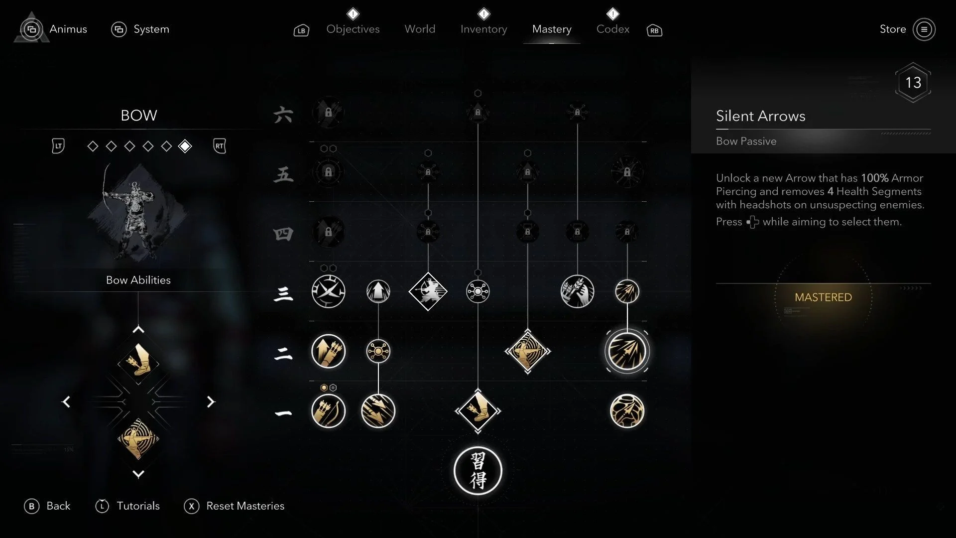 - Тихие стрелы: Особый тип стрел, игнорирующих броню и наносящих огромный урон в голову ничего не подозревающей цели. Единственный способ для Ясукэ совершать бесшумные убийства, убирая самых опасных врагов до начала открытого боя.