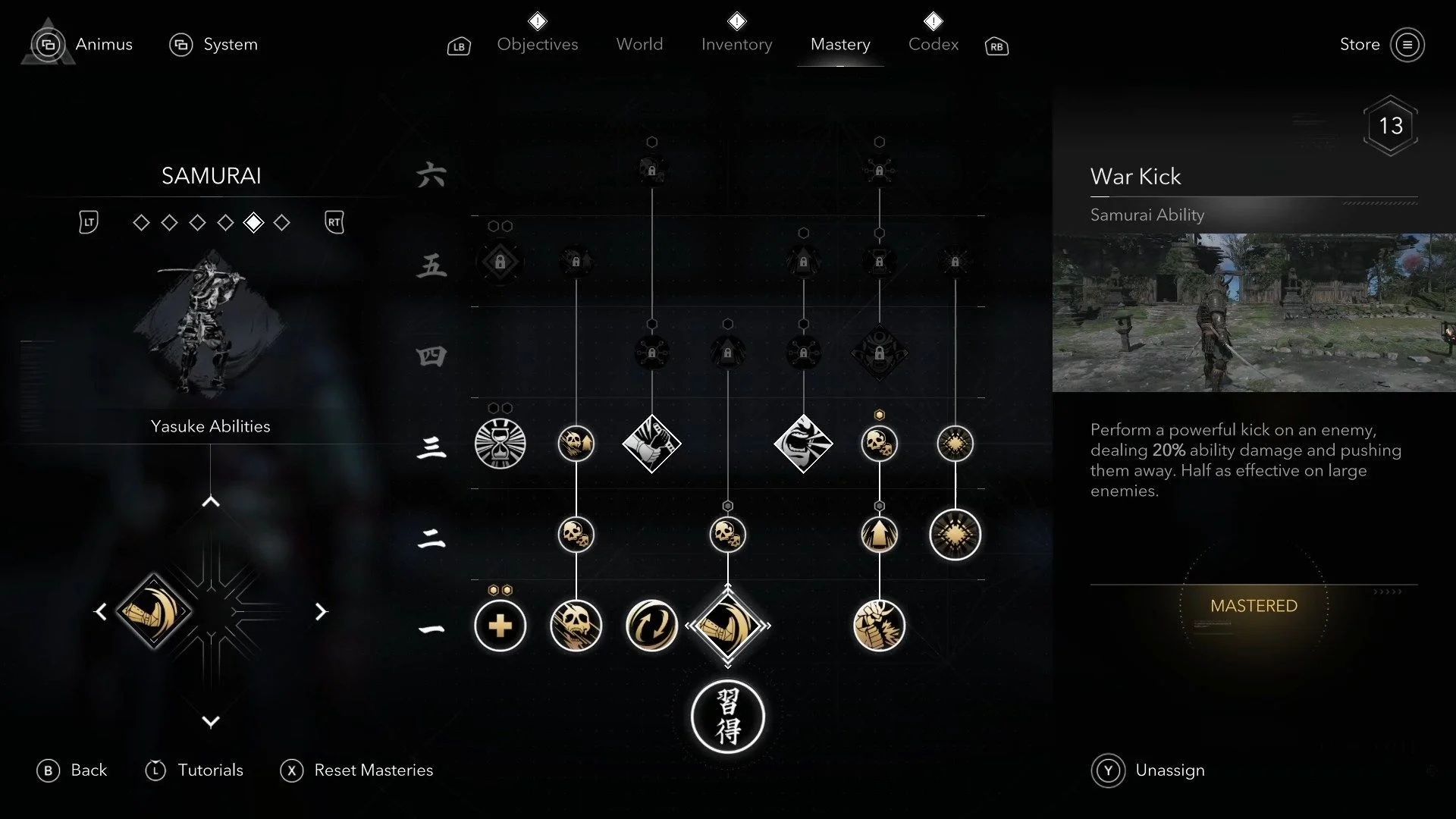 - Удар войной: Один из самых полезных навыков. Ясукэ наносит мощный, быстрый пинок, отбрасывающий противника. Держит дистанцию, прерывает комбо, сбрасывает врагов с крыш и кидает их в стены.