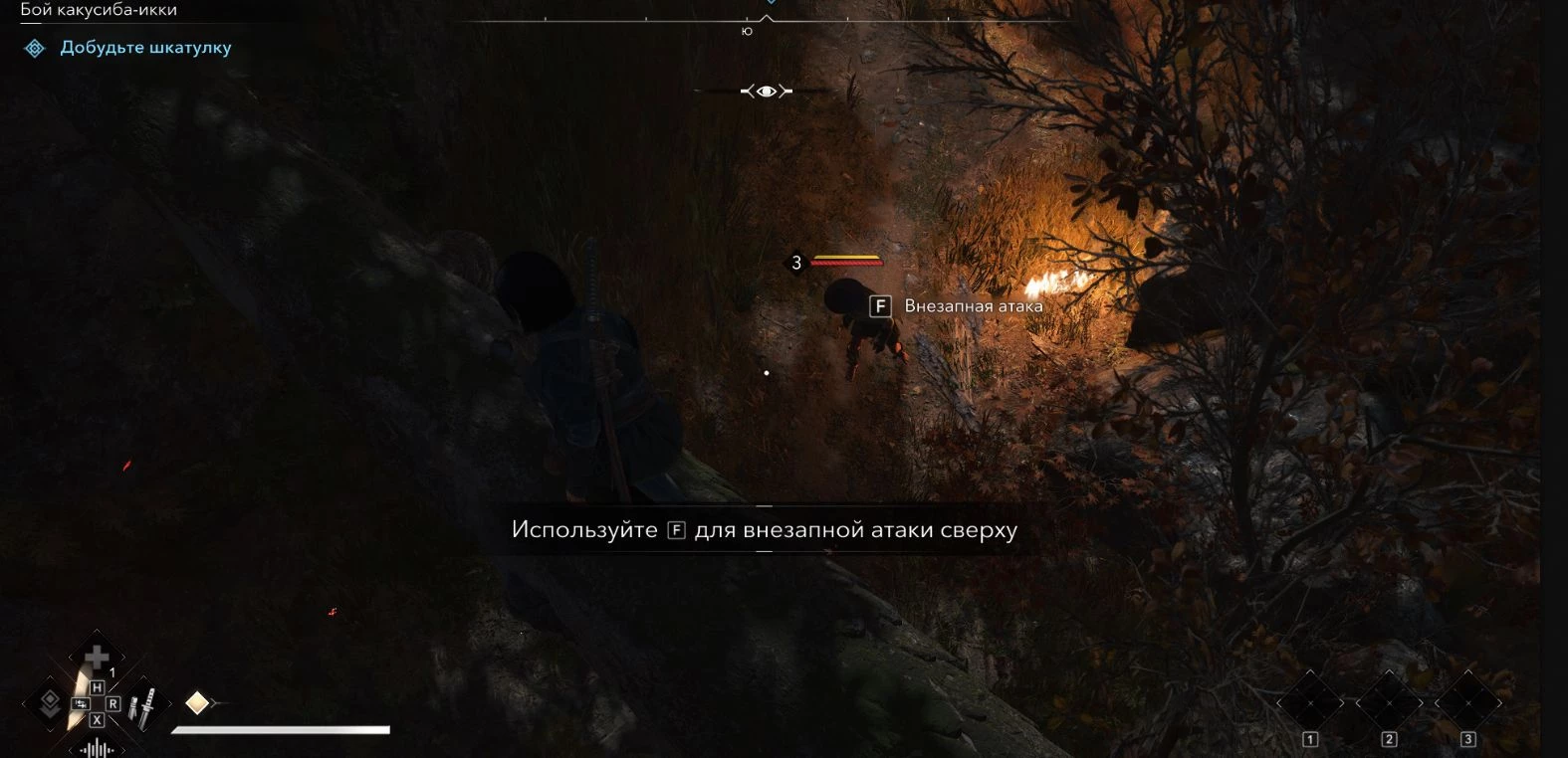 Орлиное зрение (удержание правого стика или клавиши V) - позволяет видеть врагов в зоне досягаемости Наоэ. Рекомендуется использовать перед любыми действиями.