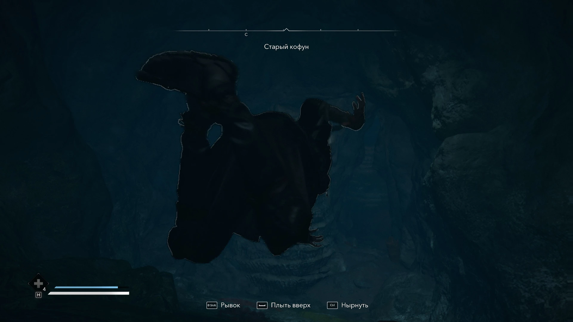 - Вы снова окажетесь в воде, где находится третий сундук. Повторно воспользуйтесь крюк-кошкой и направляйтесь по левому пути от источника света.
