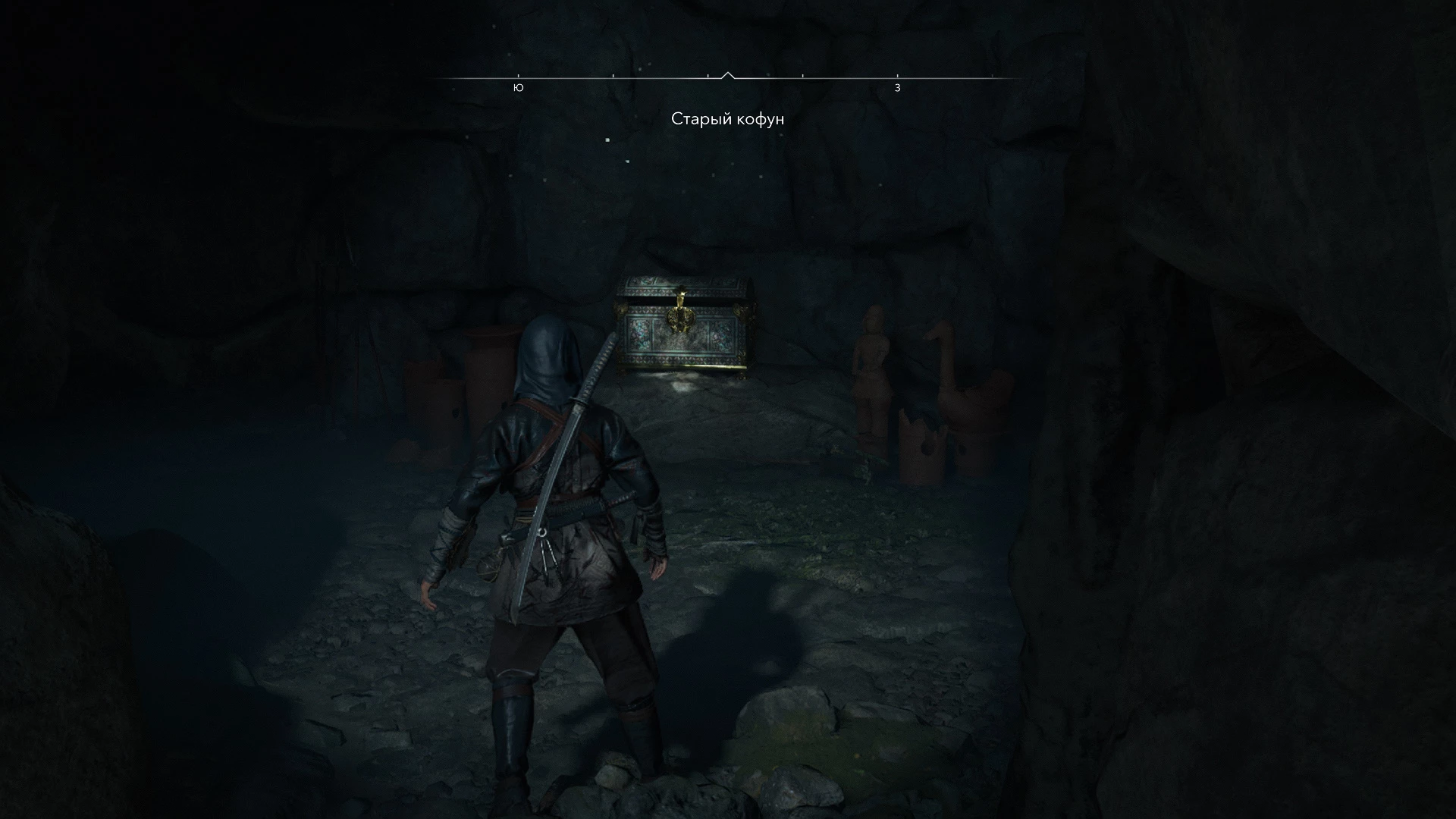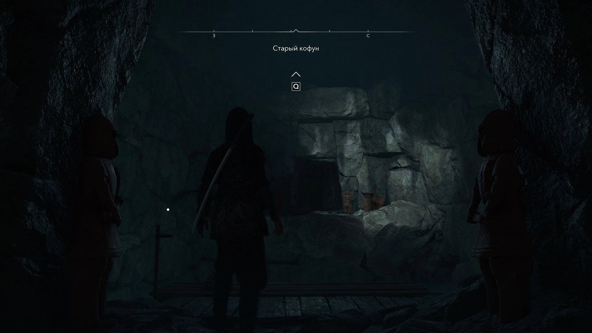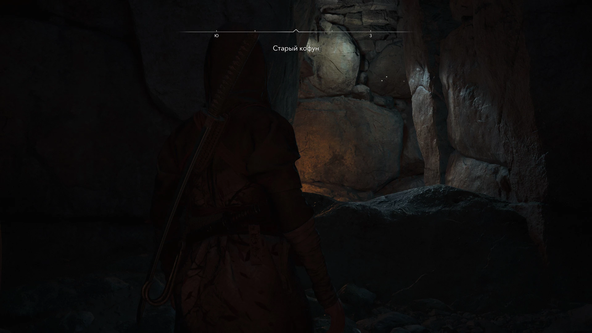 Прохождение Старого Кофуна сопряжено с кромешной тьмой, сохраняющейся даже при максимальной яркости. Доступ в эту локацию открыт только для Наоэ, поскольку Ясукэ физически не сможет проползти в тесный лаз слева. Однако в Assassin’s Creed Shadows существуют и другие Кофуны, доступные исключительно Ясукэ. Для ориентации в темноте важно запоминать освещенные участки и зажигать все попадающиеся жаровни.