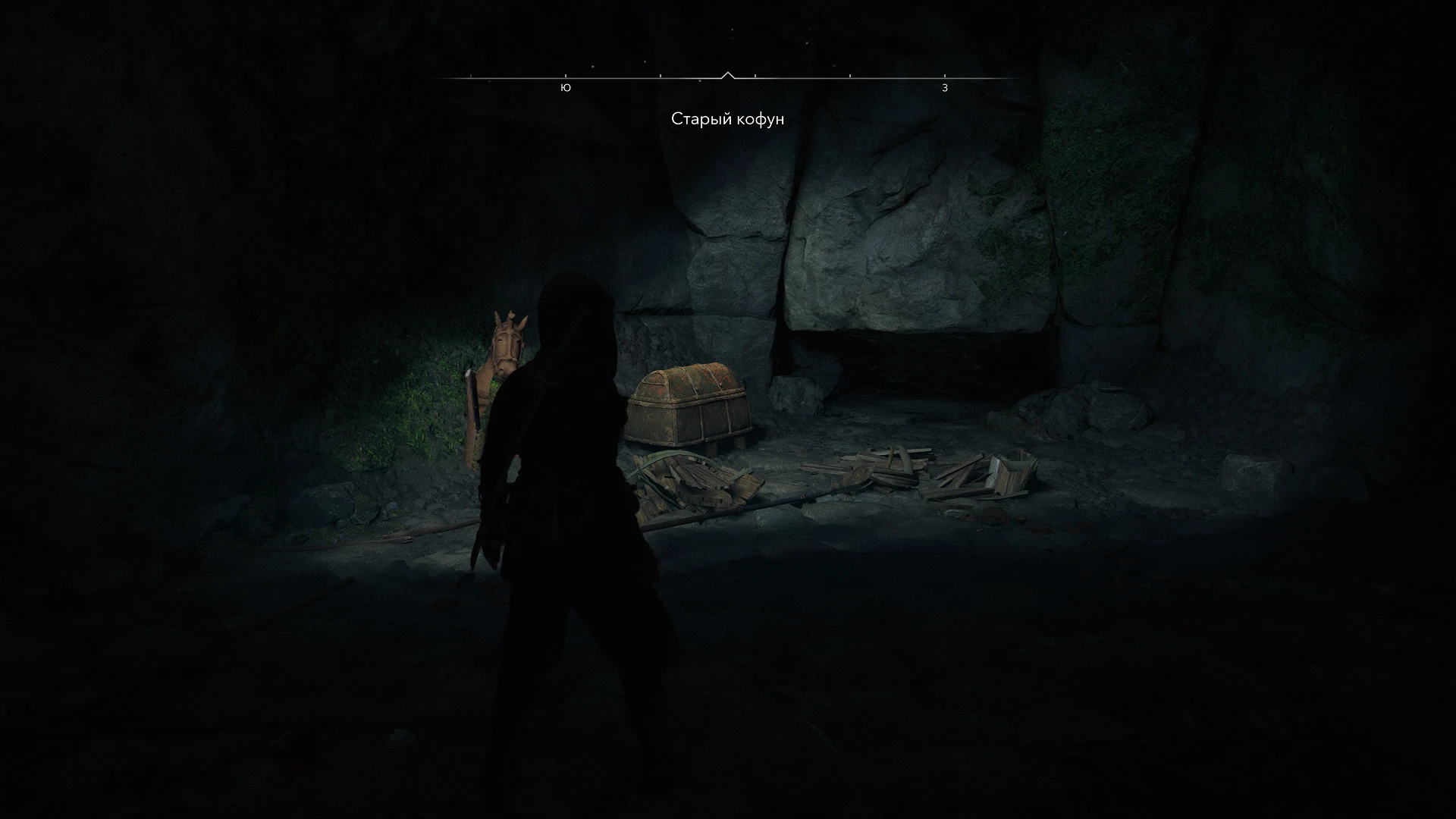 - Войдя, продвигайтесь прямо и вниз до первой освещенной зоны с сундуком. Забрав добычу, проползите в узкий проем справа внизу.