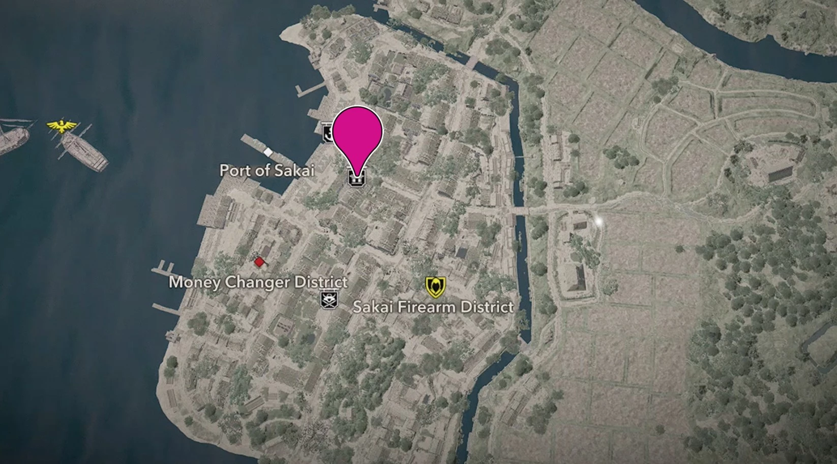 Эта коллекция продается в Сакаи, рядом с портом. Вероятно, это будет один из первых торговцев, которых вы встретите, так как Сакаи – один из первых крупных городов по сюжету. Для удобства стоит открыть все точки синхронизации, чтобы быстро перемещаться между провинциями.