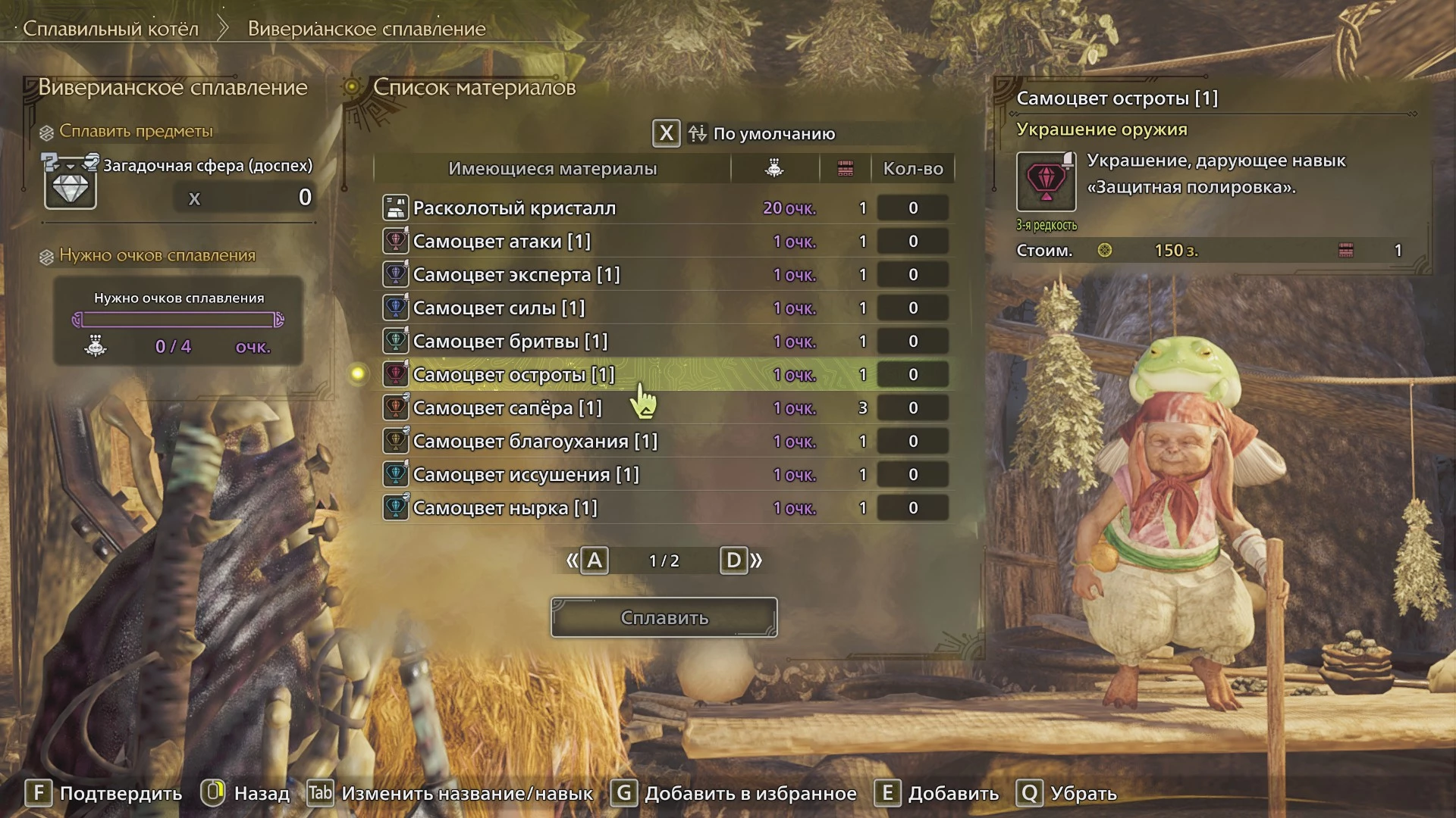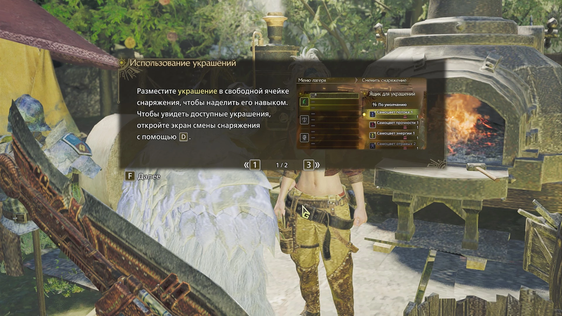 - Посетите Джемму в кузнице или воспользуйтесь палаткой в любом лагере, чтобы открыть меню работы с экипировкой.