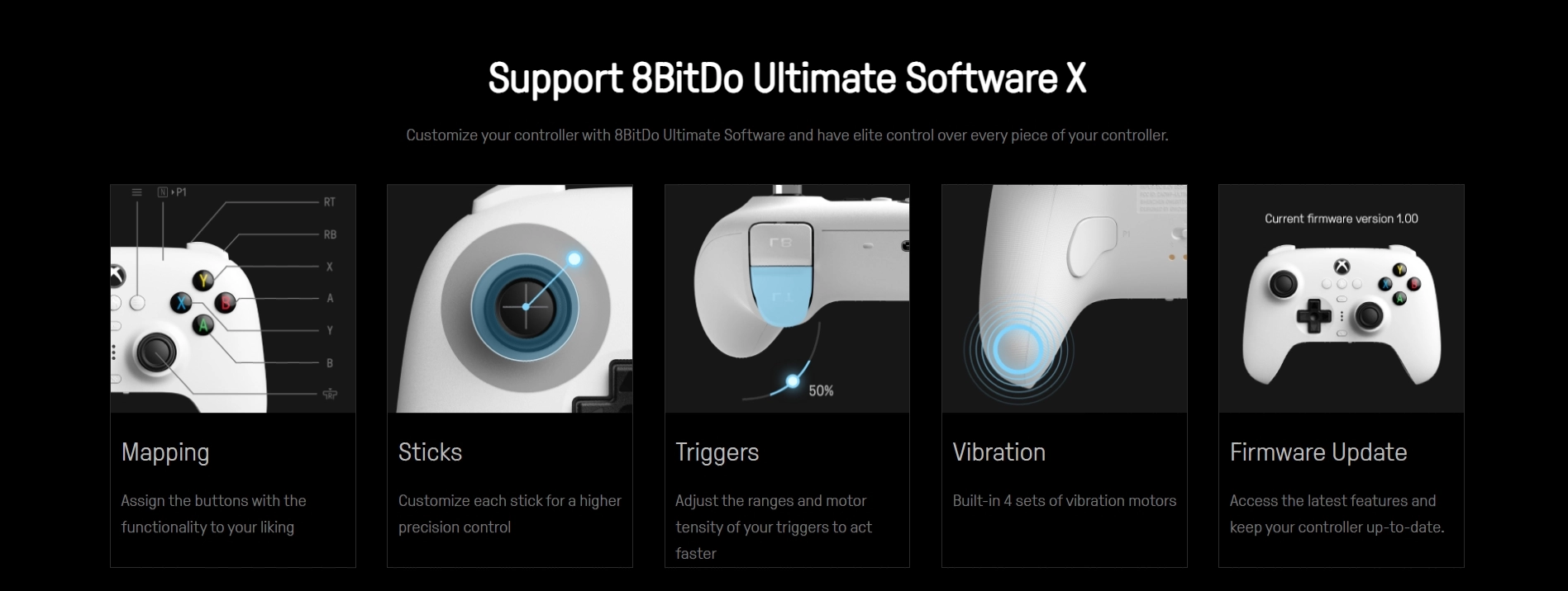 В комплекте идет док-станция для зарядки, а аккума хватает на 20 часов игры. Настраивается геймпад через их программу 8BitDo Ultimate Software X.