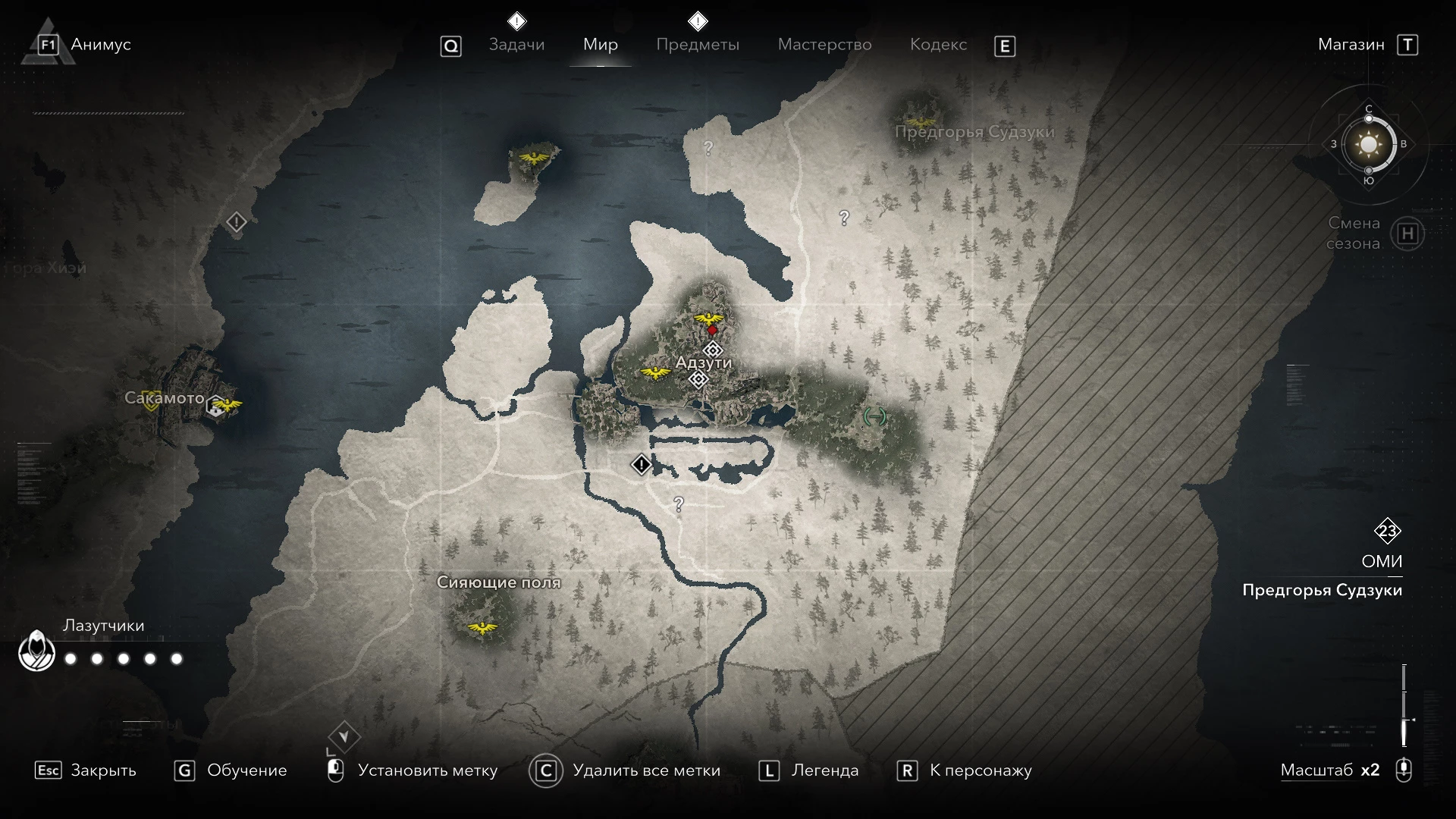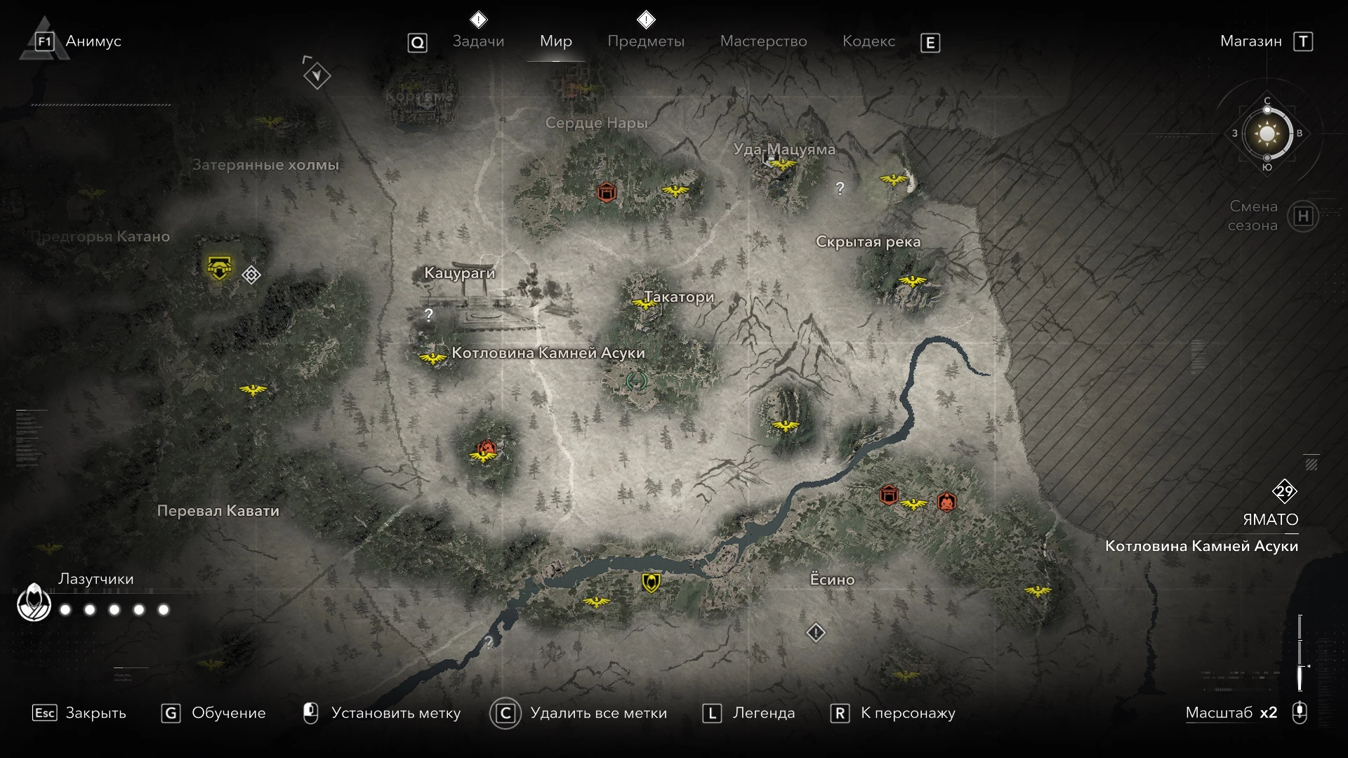 Для успешного прохождения Адзути-хётанъяма необходимо использовать Ясукэ. Внутри кофуна Адзути-хётанъяма вас ждут разнообразные загадки, эффективно использующие все уникальные особенности игры за темнокожего самурая. В отличие от большинства других гробниц, здесь вы столкнетесь с противниками, которых необходимо устранить, стенами, требующими взрыва, и платформами, которые нужно перемещать, чтобы Ясукэ мог добраться до новых участков подземелья. Важно учитывать уровень локации, так как без должной прокачки персонажа вы просто не сможете одолеть врагов. За успешное завершение кофуна Адзути-хётанъяма вы получите в награду легендарный лук "Сердечная Рана". Точное местонахождение указано на изображении ниже.