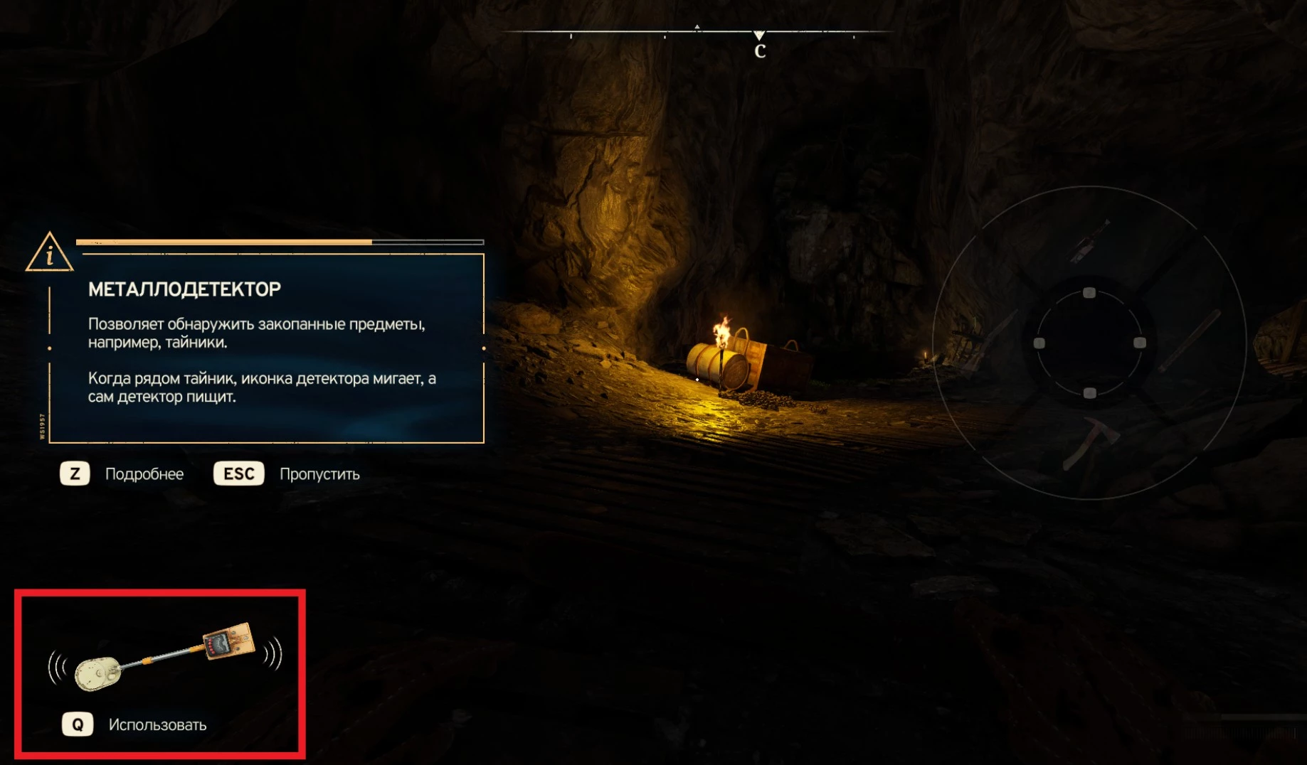 Он автоматически помещается в отдельный слот инвентаря и не занимает место в быстром доступе. Не нужно прочесывать всю карту, ведь при обнаружении ценного предмета в левом нижнем углу появится иконка с кнопкой для активации устройства.
