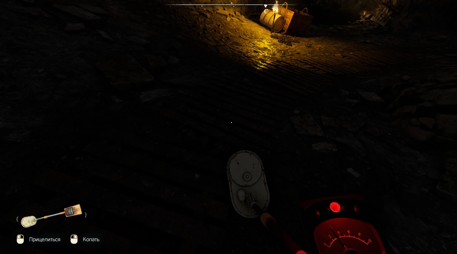 Далее, нужно смотреть на циферблат со стрелкой и пять лампочек на приборной панели металлоискателя. Лампочки загораются красным в зависимости от вашего положения при нажатой кнопке прицеливания. Если горит центральная лампочка, продолжайте двигаться прямо. В противном случае скорректируйте движение вправо или влево.