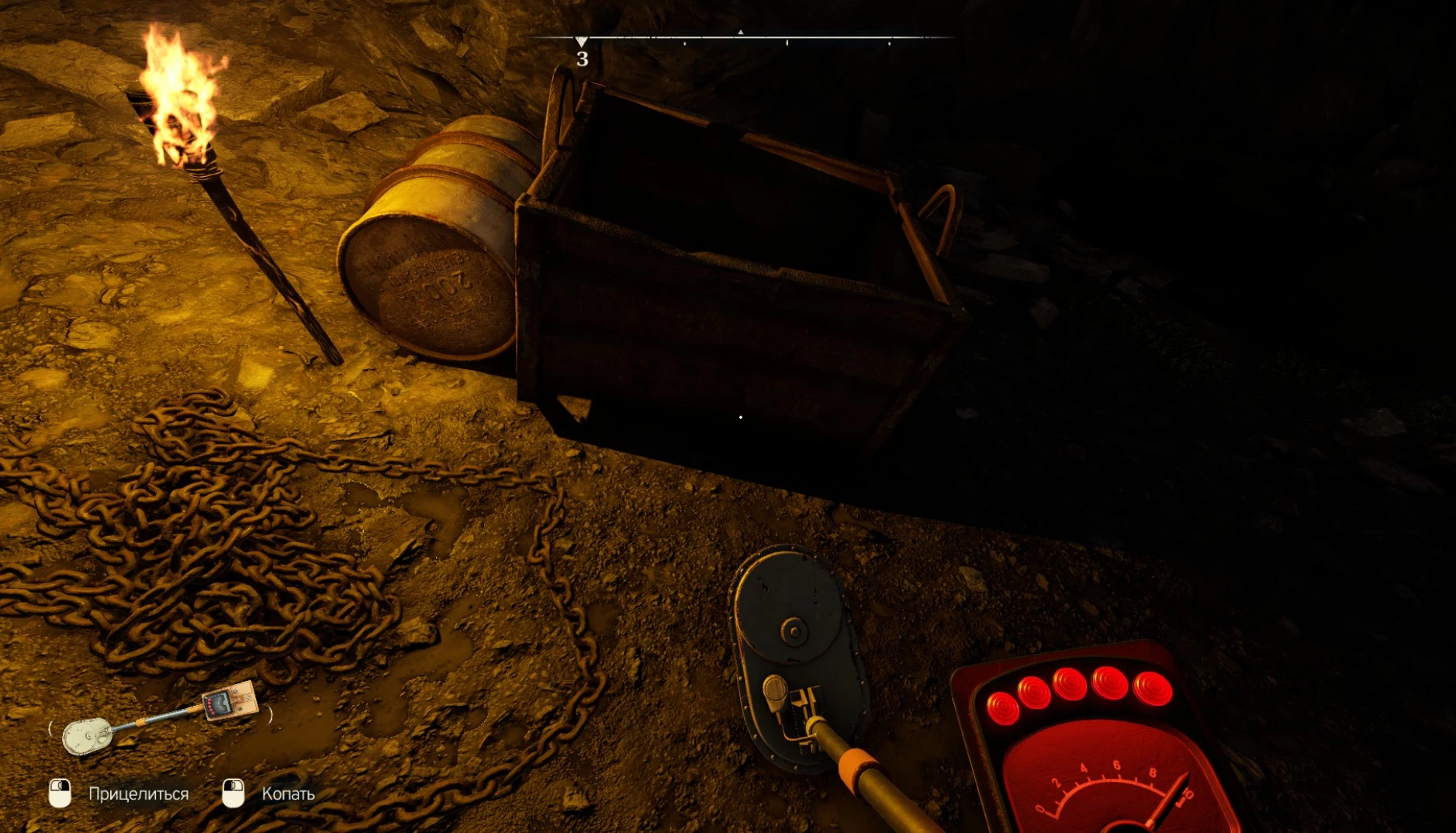 Индикатор показывает, насколько близко вы продвинулись к желаемому результату: отметка "0" сигнализирует об удаленности от цели, в то время как "10" указывает на ее непосредственную близость. Когда металлоискатель издает громкий сигнал и все пять световых индикаторов загораются, это служит знаком к нажатию кнопки "Копать".
