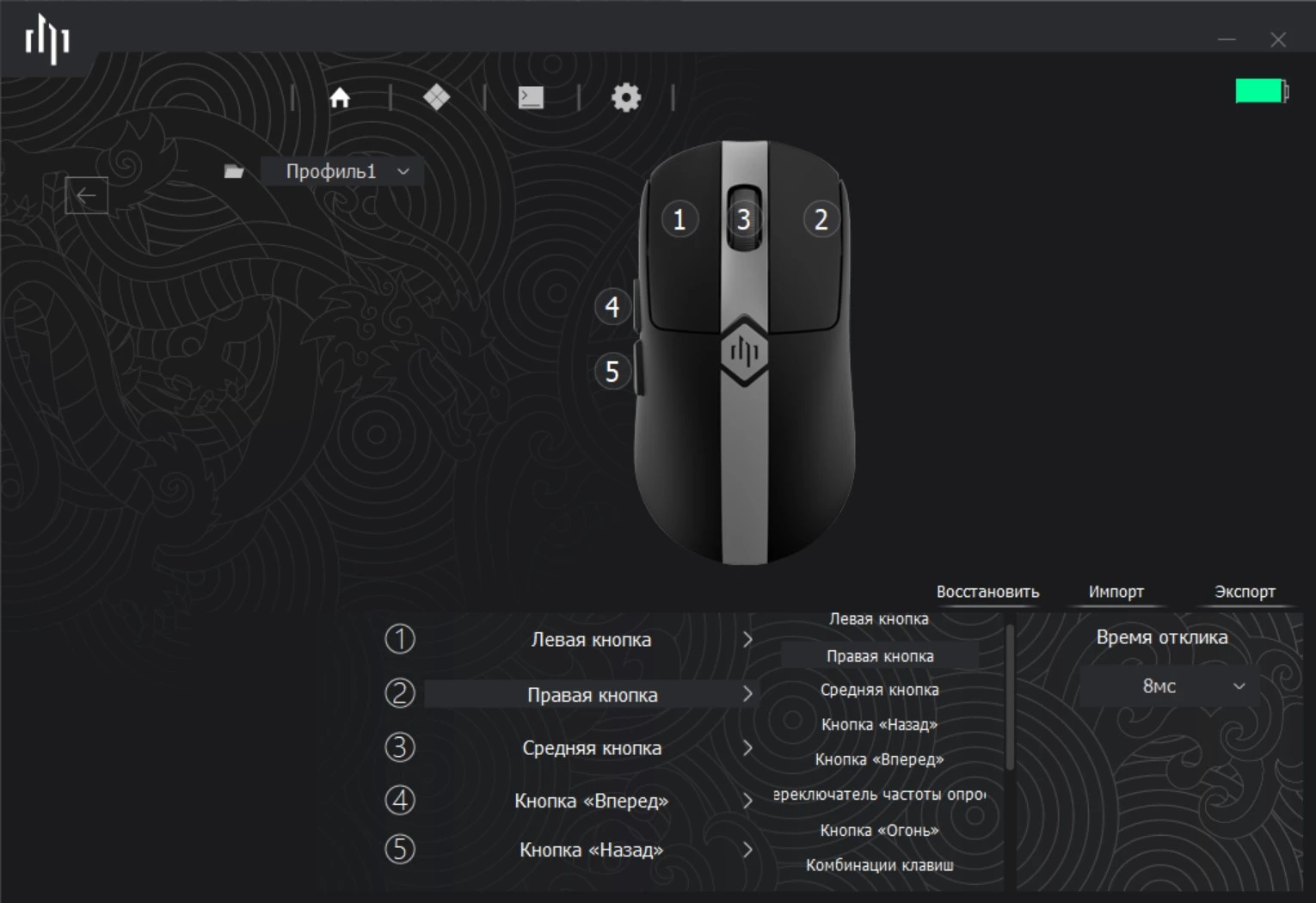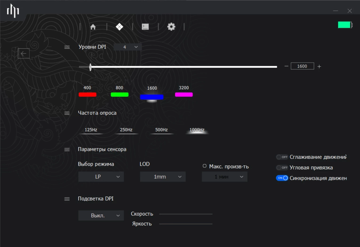 В приложении можно переназначить функции всех кнопок мыши, настроить уровни DPI и частоту опроса, создавать макросы, обновить прошивку, выполнить сопряжение с ресивером и настроить время перехода в спящий режим.