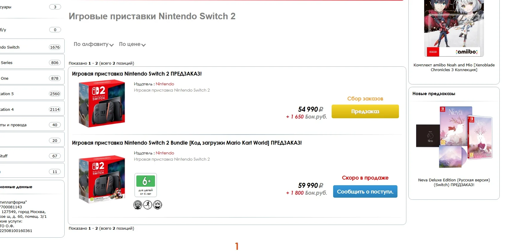 В магазине «Видеоигр.Нет» Nintendo Switch 2 с кодом загрузки Mario Kart World можно будет купить за 60 000 рублей. Предзаказ на саму консоль стоит 55 000 рублей.