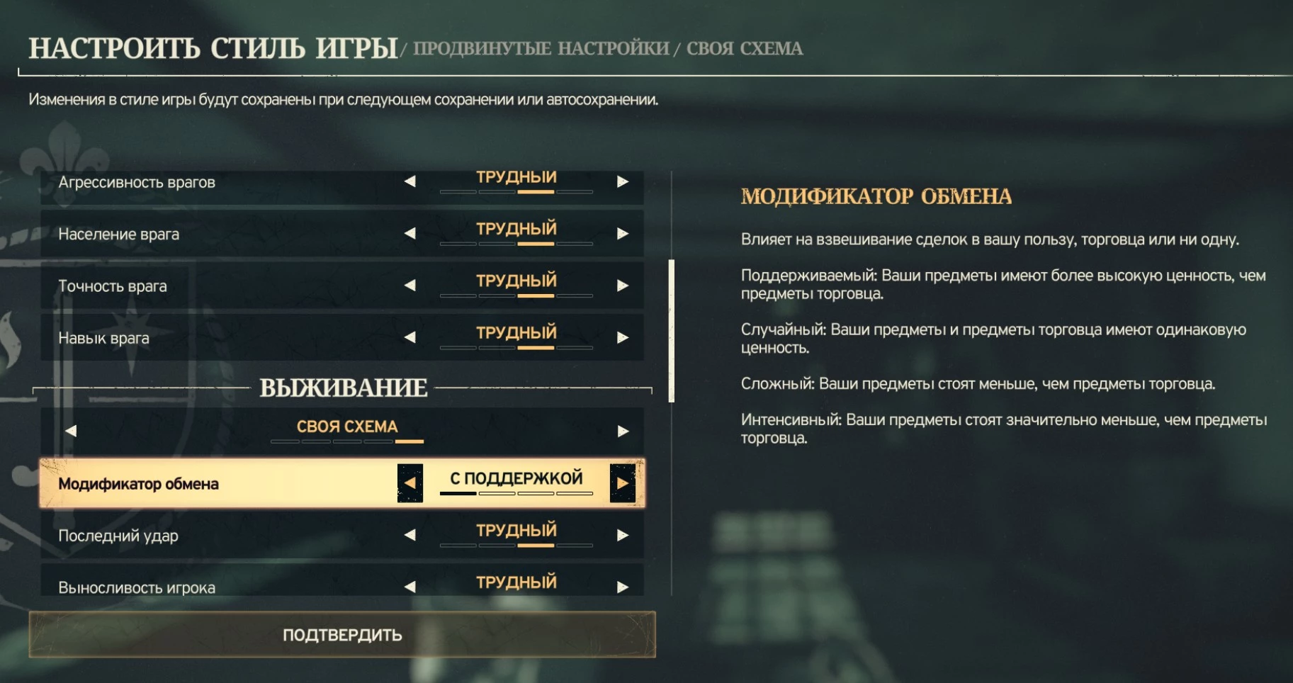 В расширенных настройках стиля игры, доступных как при создании персонажа, так и в процессе игры, можно изменить параметр обмена. Просто передвиньте ползунок модификатора влево, выбрав режим "С поддержкой", и торговцы будут принимать ваши предметы по выгодной цене.
