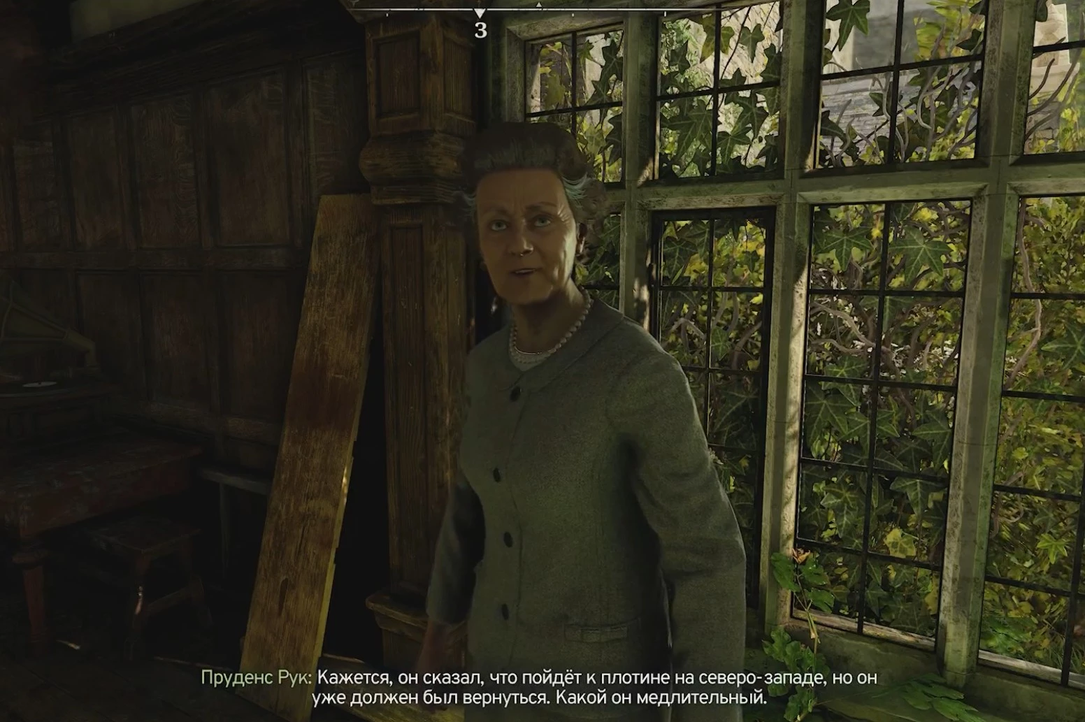 Из ее сумбурной речи становится ясно, что ученые из "Развязки" посещали оранжерею (которая теперь закрыта), а Дженкс, дворецкий мисс Пруденс, отправился к плотине на северо-западе и не вернулся.
