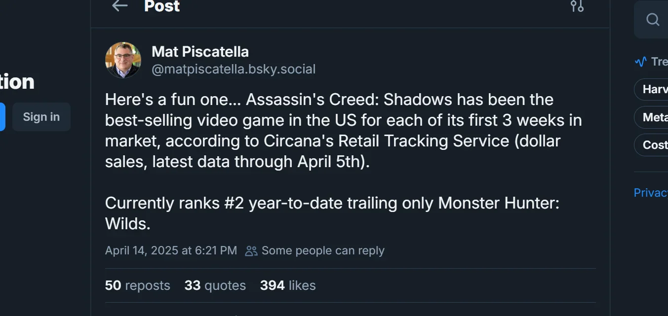 В общем зачете самых продаваемых игр 2025 года в США Assassin’s Creed Shadows оказалась на второй строчке, уступив первенство Monster Hunter Wilds, которая появилась в продаже почти на месяц раньше. Ubisoft ранее заявляла, что в первую неделю после релиза в Assassinʼs Creed Shadows играли более трех миллионов пользователей, хотя точные данные о продажах не раскрывались.