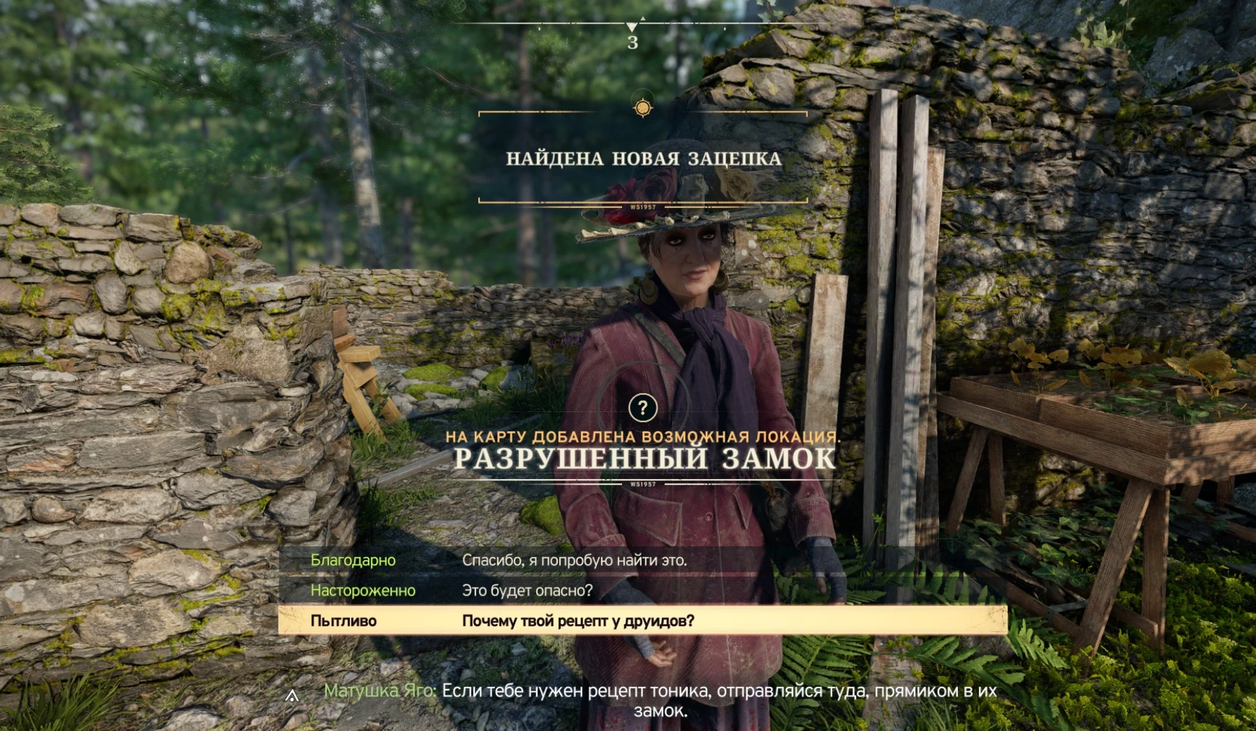 Помимо торговли, после исчерпания всех диалогов, Матушка Яго расскажет о своей беде: проклятые друиды похитили ее бесценную книгу с рецептами.