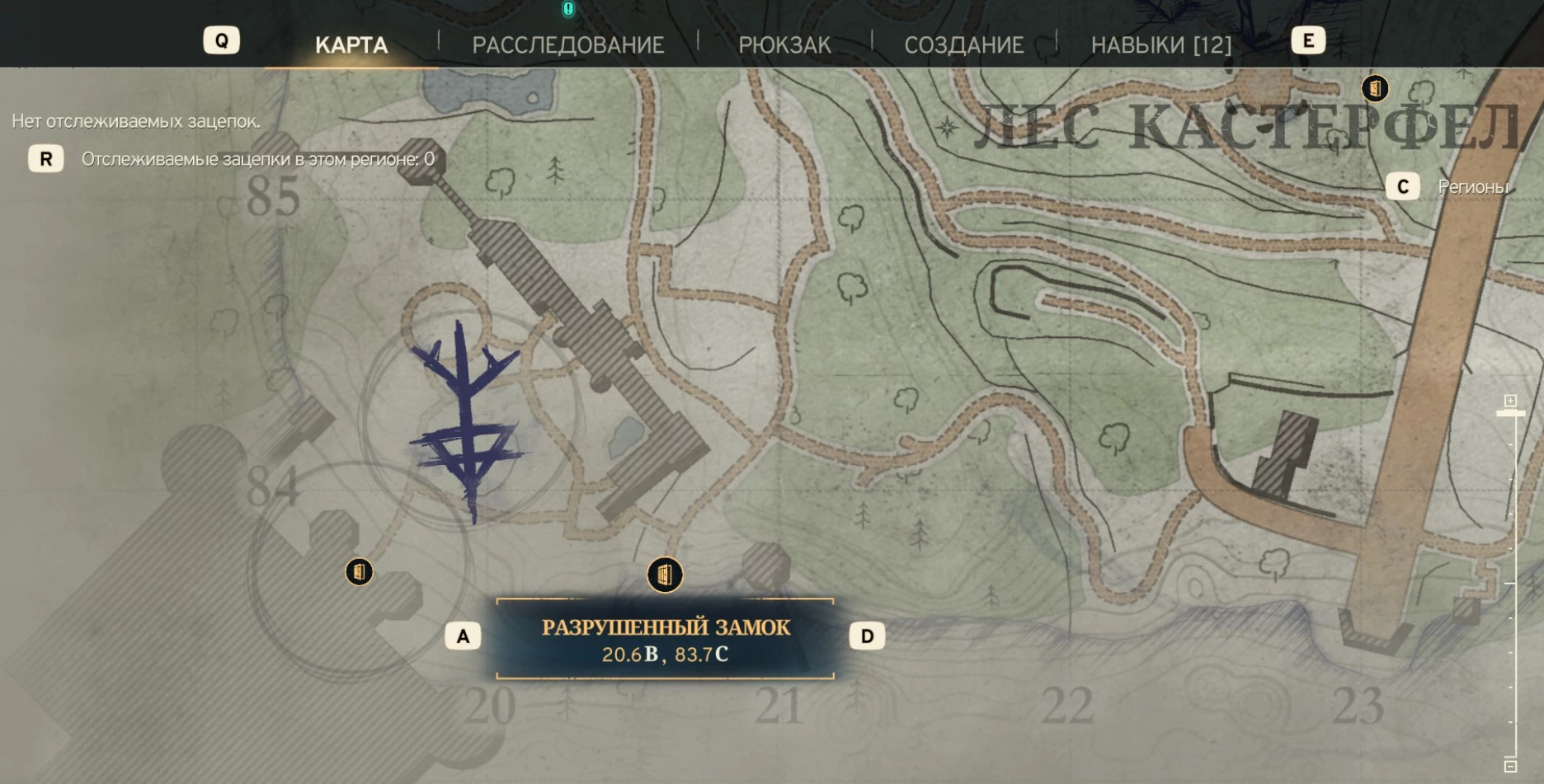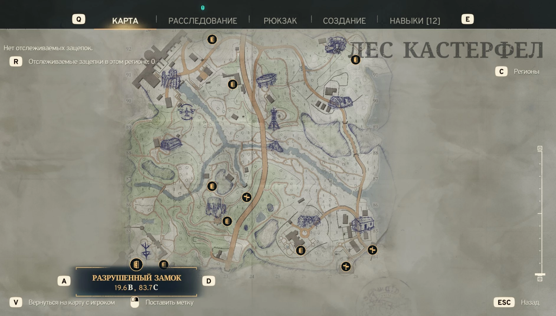 После разговора с Матушкой Яго на карте, в противоположной части леса Кастерфел, появится метка лагеря друидов. Координаты замка: 19.6° в.д., 83.7° с.ш.