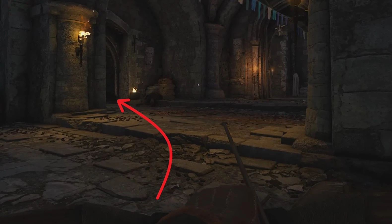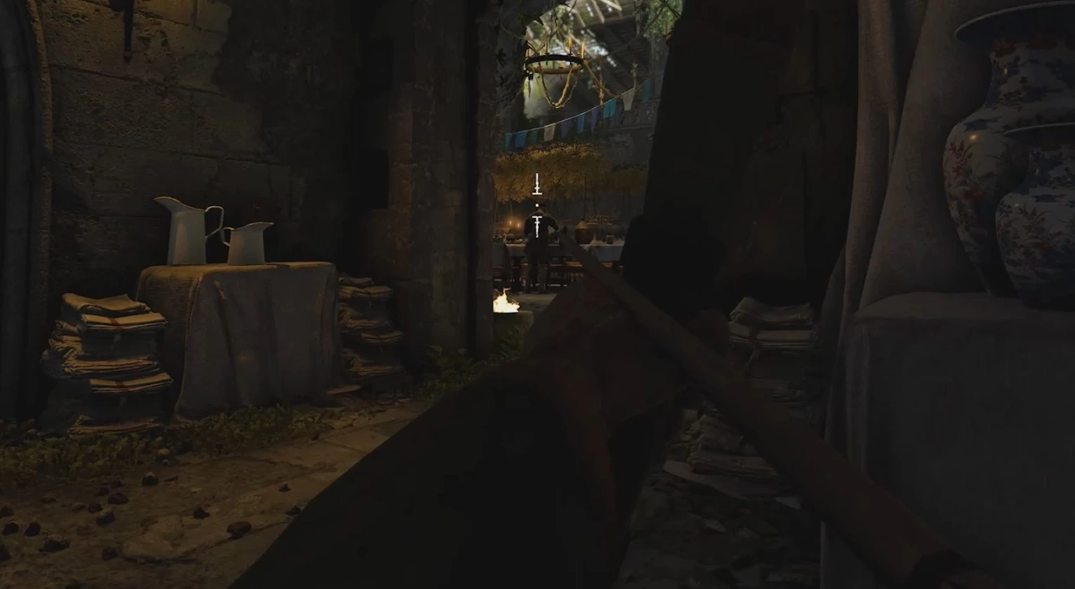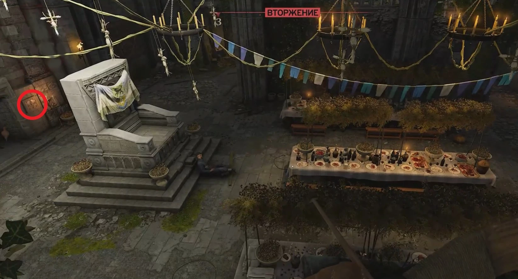 Далее можно войти в тронный зал, но там будет много врагов, поэтому лучше вернуться на кухню и подняться по лестнице на балкон.
