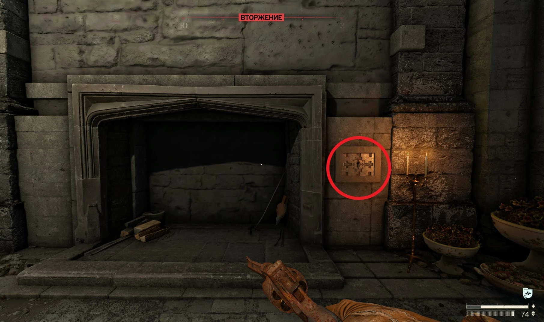 Справа от камина вы увидите замочную скважину, куда нужно вставить найденный ключ, чтобы открыть секретный проход.