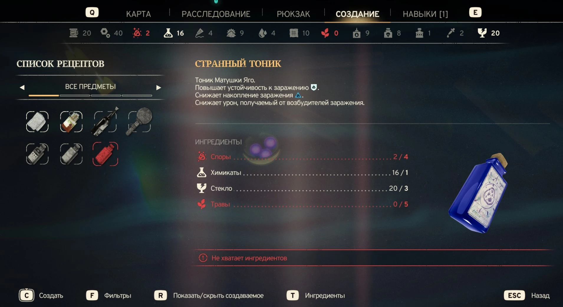 На соседнем столе вы увидите фиолетовые споры. Рекомендуем сразу же их собрать, так как они – важный ингредиент для создания тоника, наряду с химикатами, стеклом и травами.