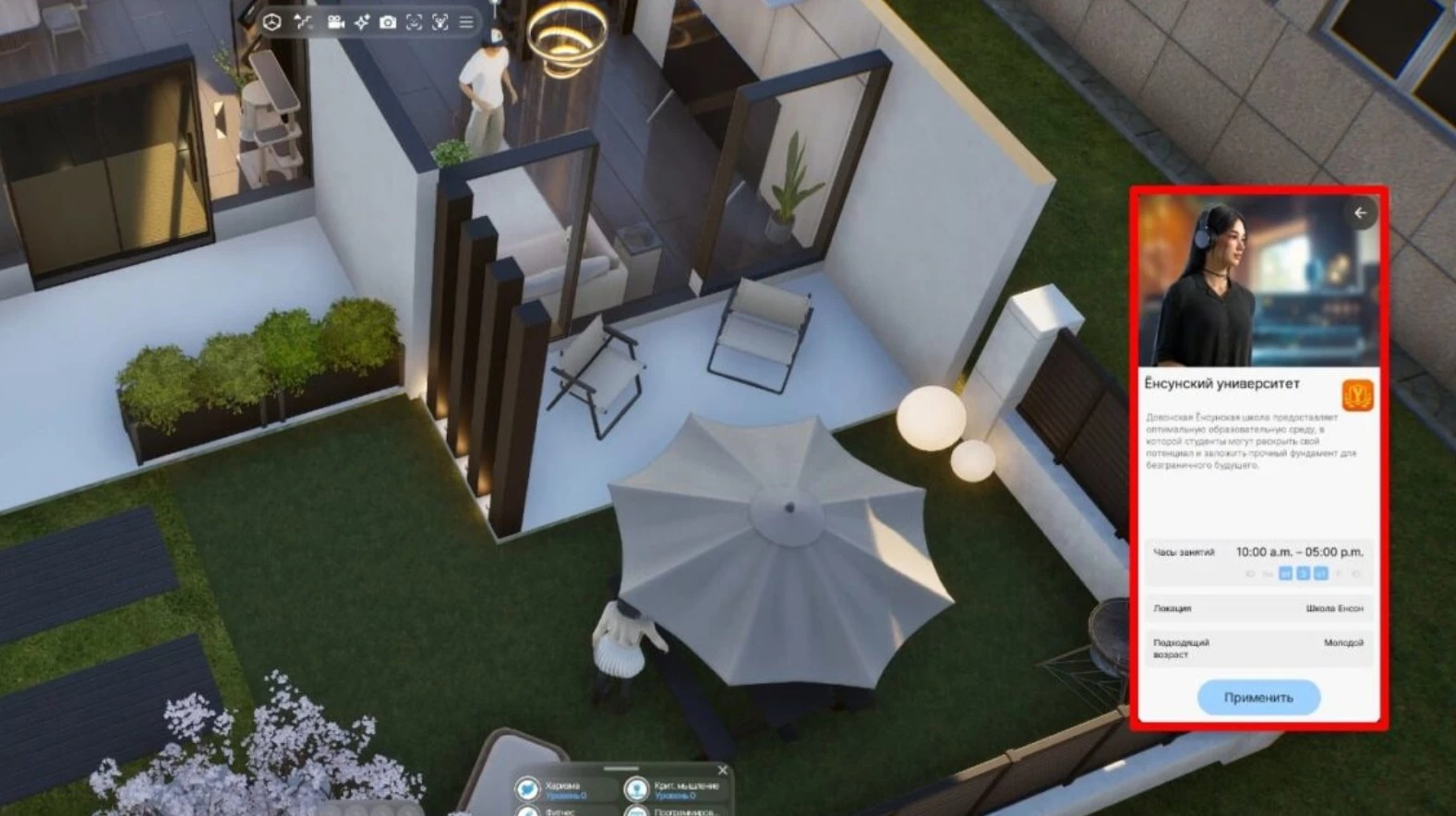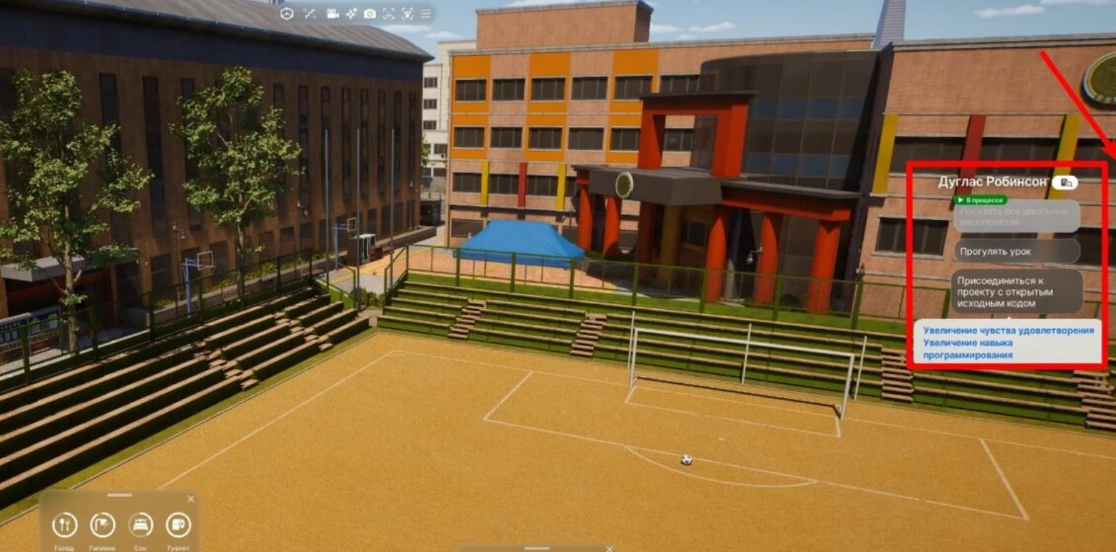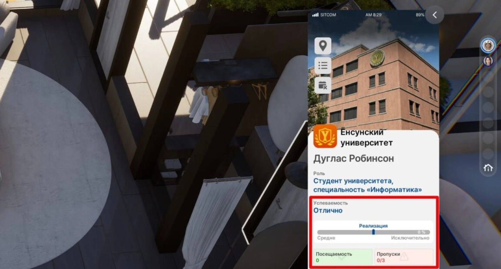 Вместо прямого управления, в меню персонажа можно выбрать иконку академической шапочки и указывать, чем занимается аватар в университете. При наведении на активность отображаются навыки, которые развиваются во время занятия.