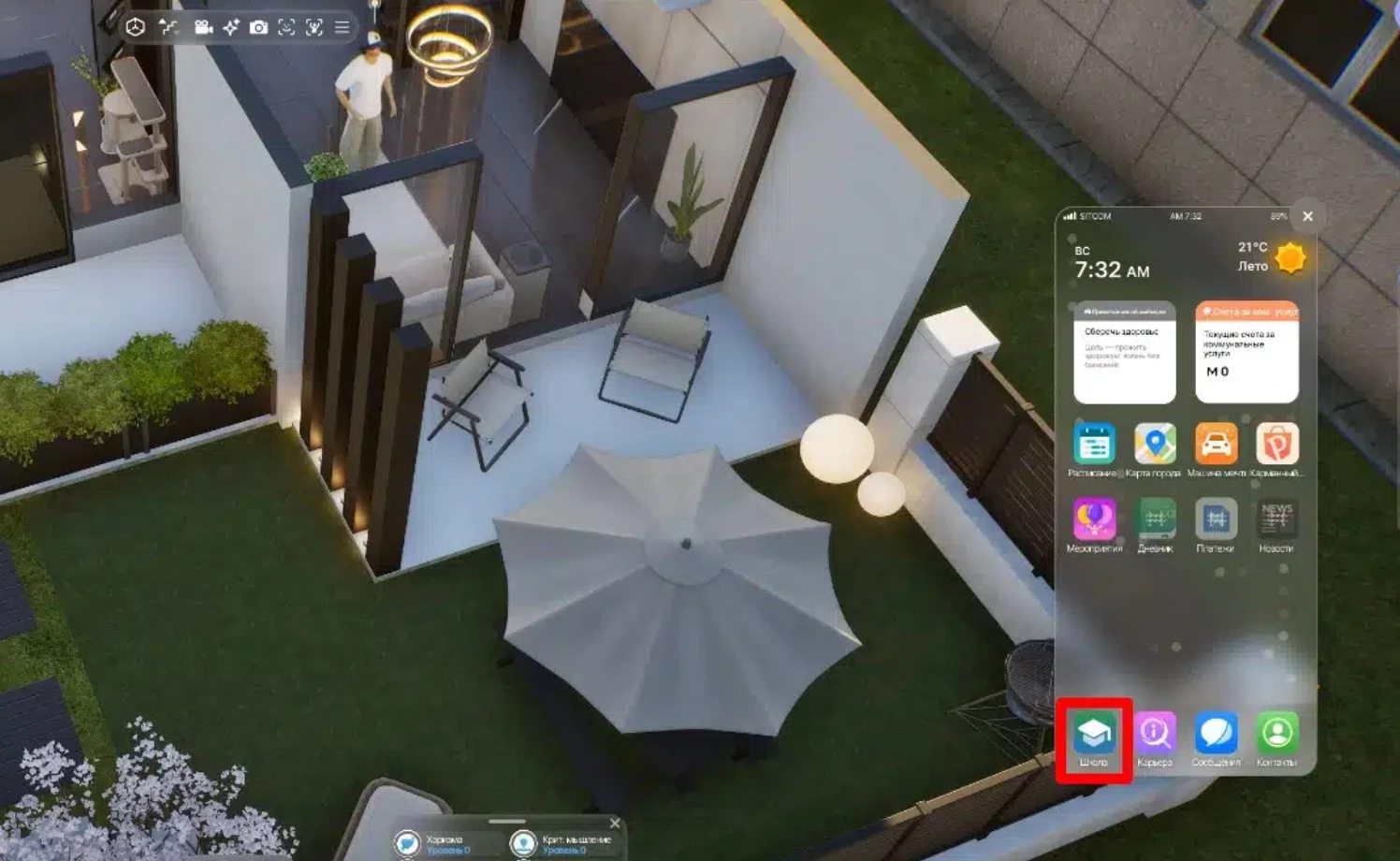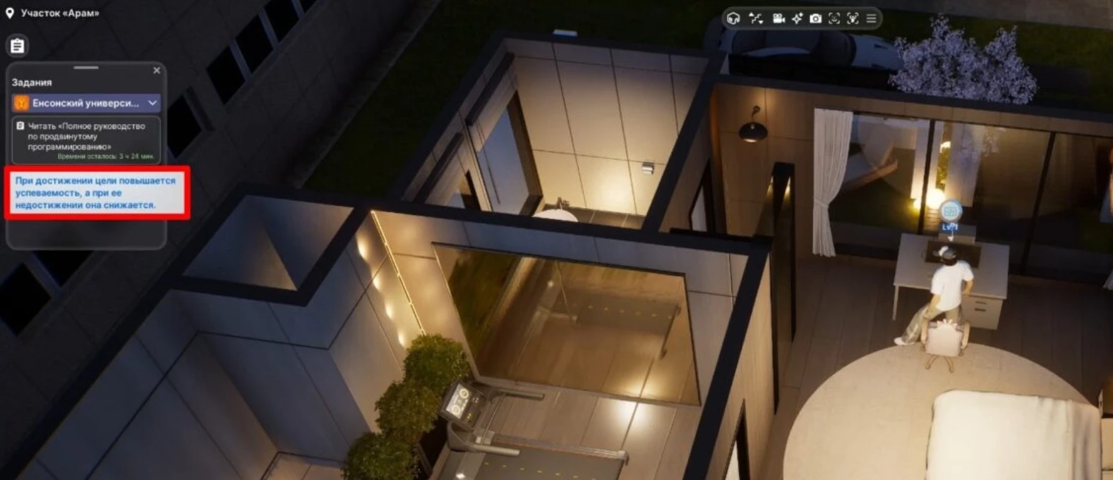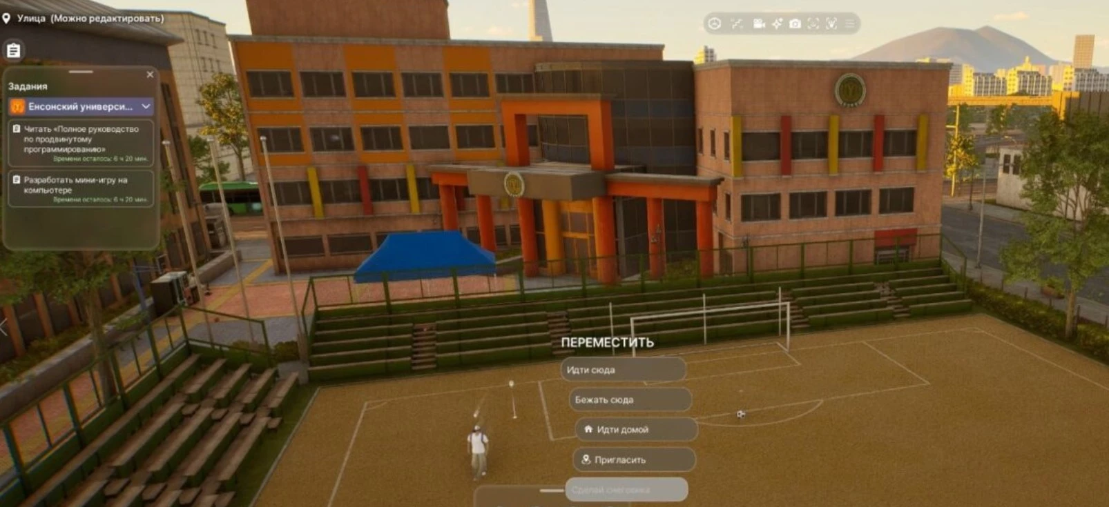 Вместо прямого управления, в меню персонажа можно выбрать иконку академической шапочки и указывать, чем занимается аватар в университете. При наведении на активность отображаются навыки, которые развиваются во время занятия.