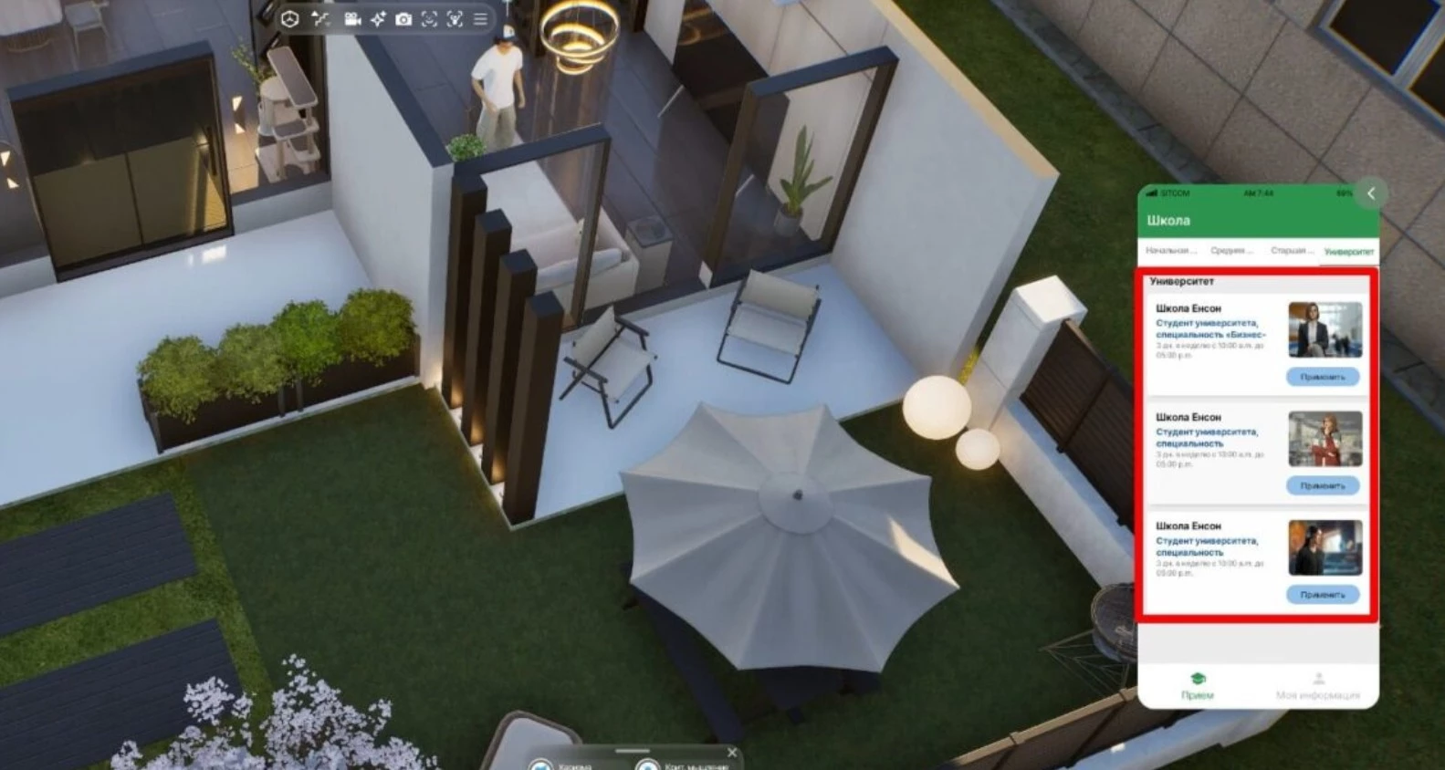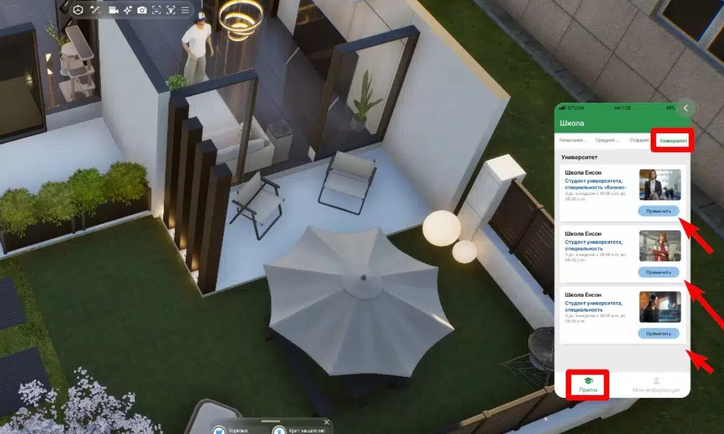 Поступить в университет могут только молодые Зои. Для подачи документов откройте телефон, нажав на него рядом с аватаром или клавишей «P». Зайдите в приложение «Школа» и найдите раздел «Университет». Здесь вы сможете ознакомиться со всеми предложениями и поступить в один из трех университетов.