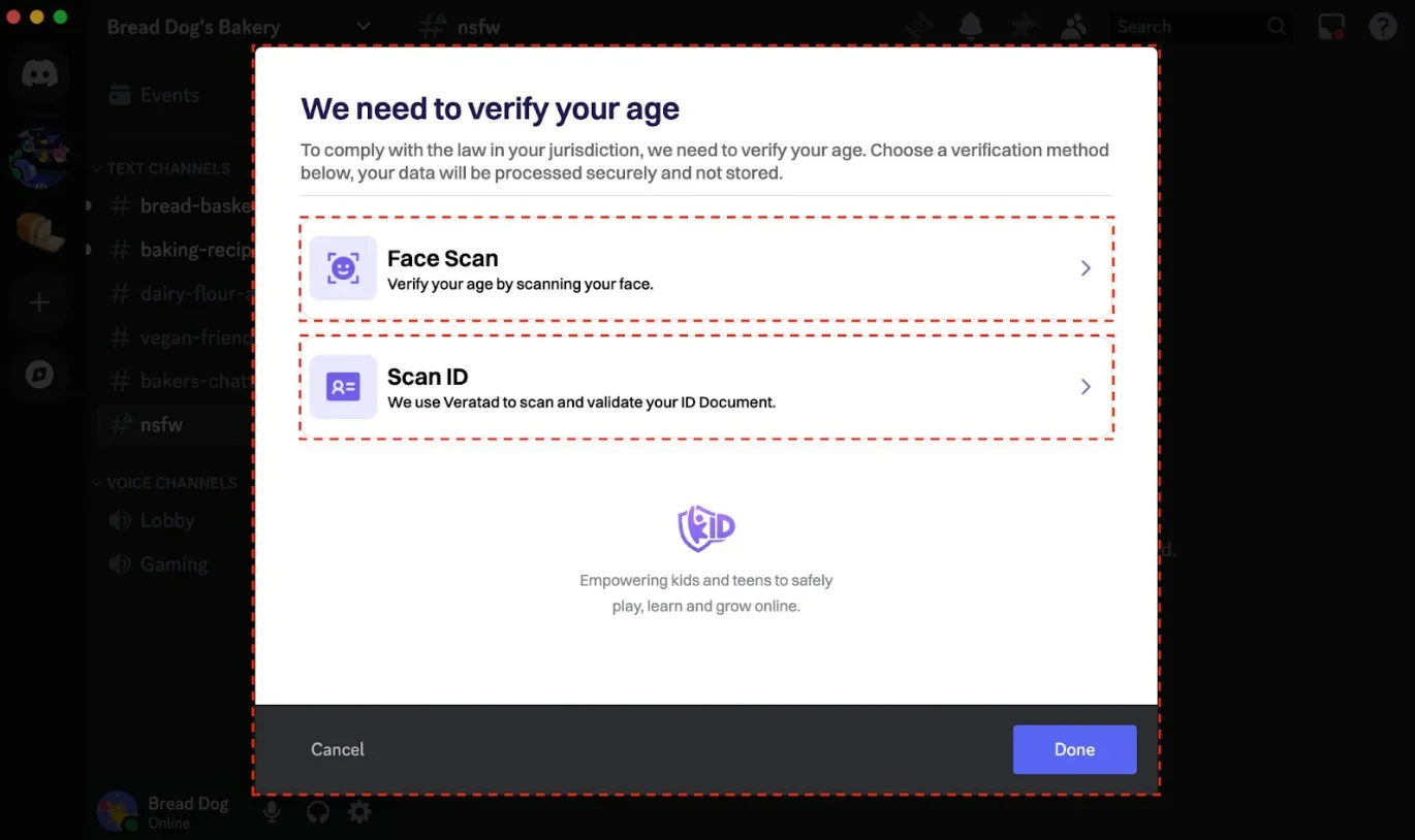 При попытке открыть контент, скрытый фильтром, Discord предлагает отсканировать лицо через веб-камеру или смартфон. Альтернативный вариант – загрузка фото удостоверения личности через QR-код.