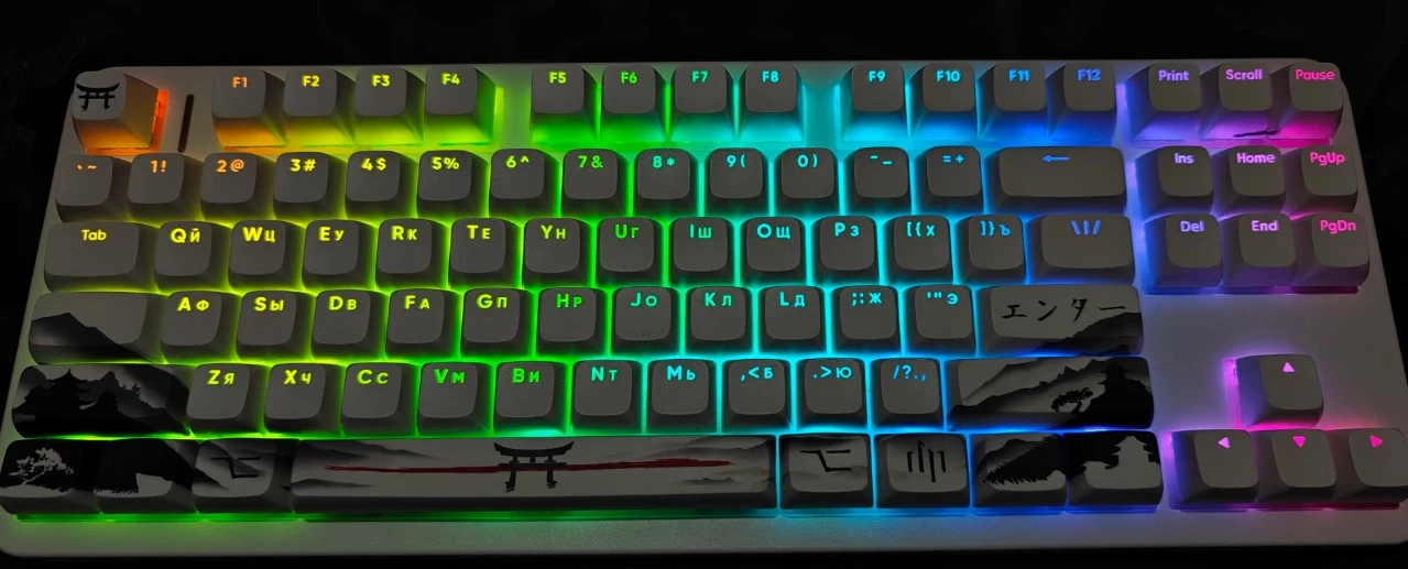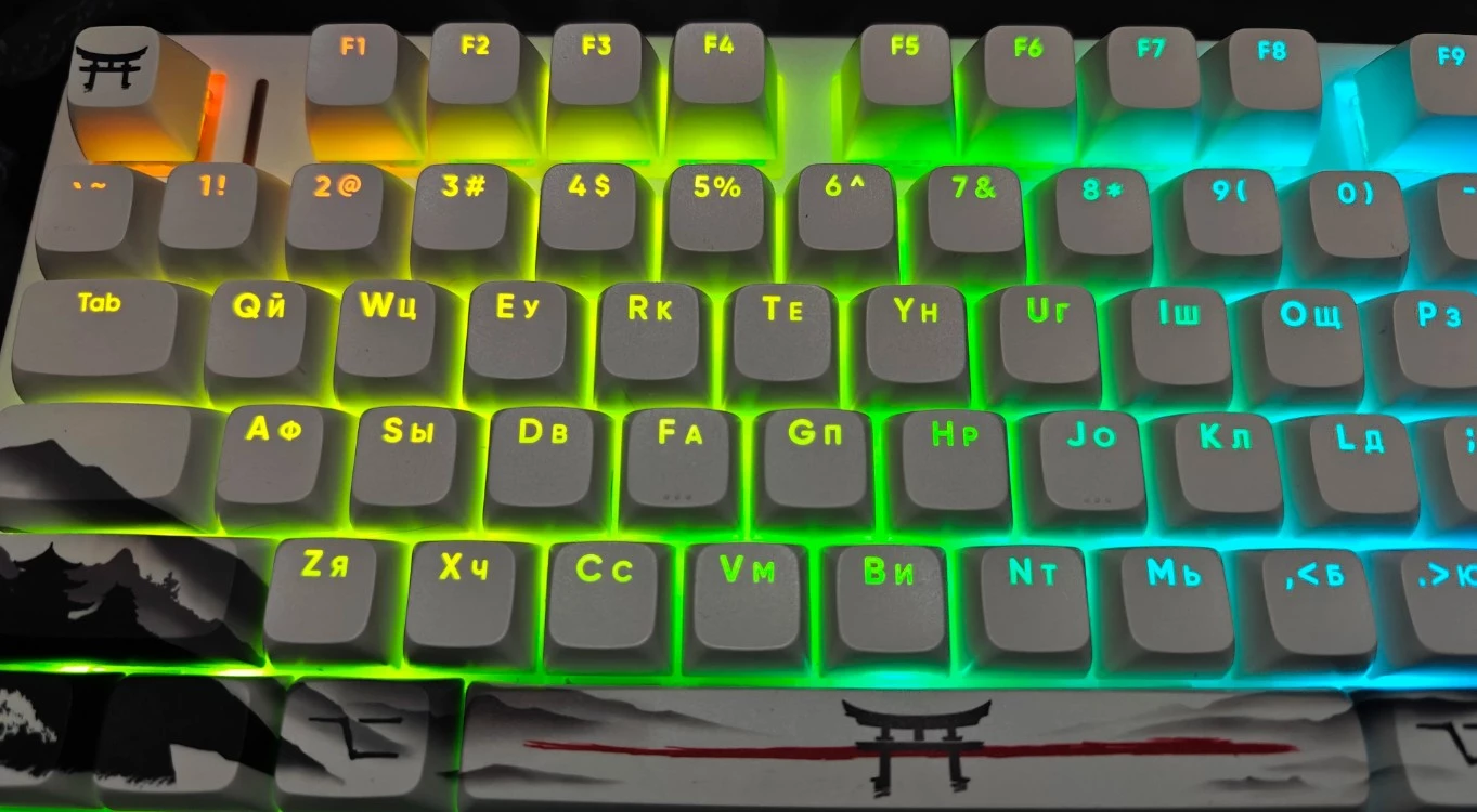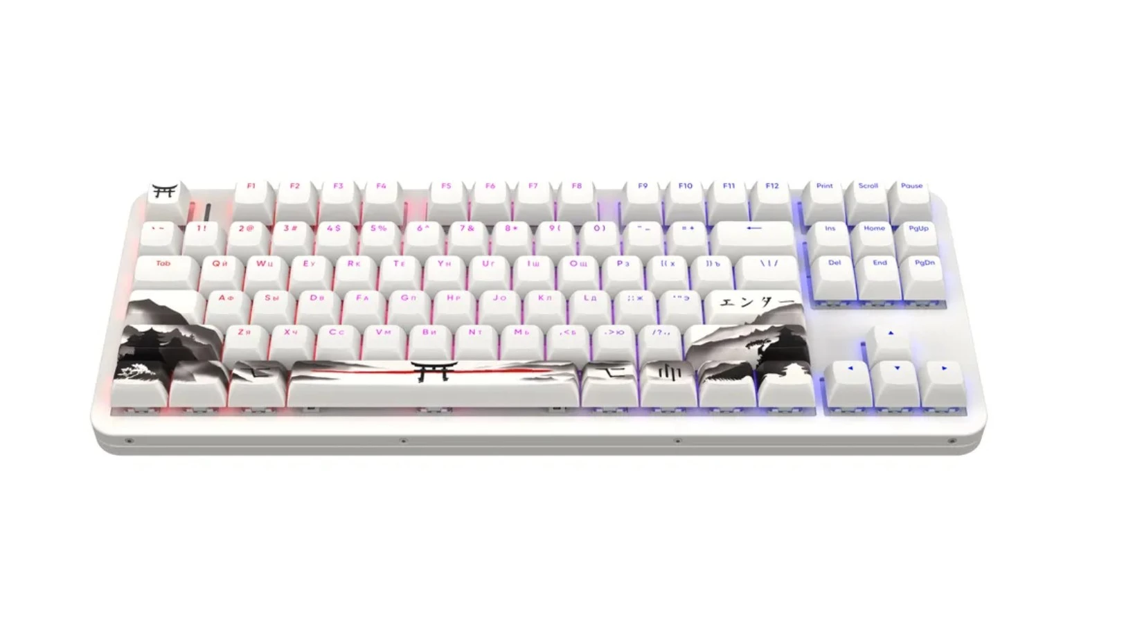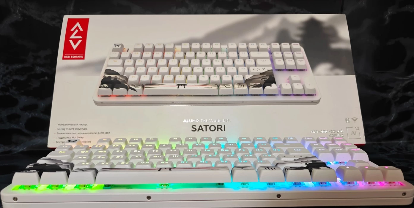 Дизайн Satori сочетает в себе сдержанность и привлекательность. В отличие от ярко-синей Red Square Alumix TKL Classic Pakuru, эта модель выполнена в более спокойной цветовой гамме: белый корпус и белые клавиши дополнены рисунком, изображающим живописный японский пейзаж. Однако, при желании, можно заменить эти колпачки на нейтральные белые, которые входят в комплект.