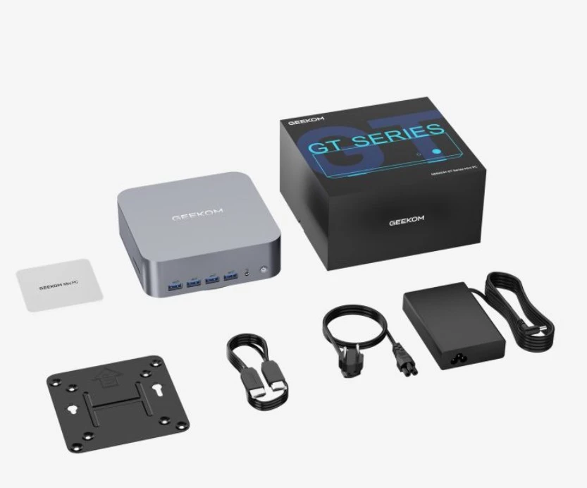 Понимая, что мини-ПК может столкнуться с трудностями в процессе доставки, GEEKOM уделяет особое внимание надежности упаковки. GT1 Mega поставляется в прочной картонной коробке с названием линейки и наклейкой, содержащей информацию о конфигурации.