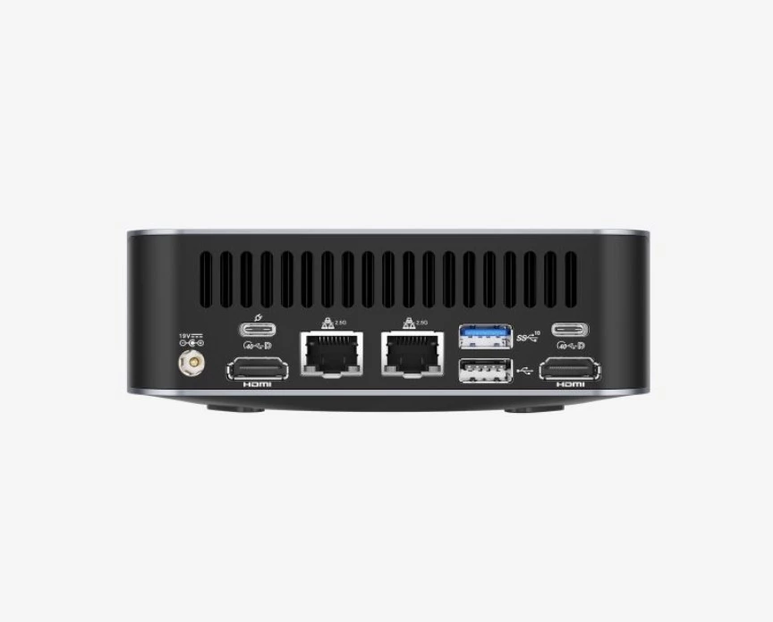 На передней панели расположены четыре порта USB-A 3.2 Gen2, комбинированный разъем 3,5 мм и кнопка включения. На задней панели находятся еще один USB-A 3.2 Gen2, USB 2.0, два порта USB 4.0 Type-C, два HDMI 2.0, два RJ45 LAN (2.5G) и разъем для подключения питания. Картридер и замок Kensington расположены на боковых сторонах.