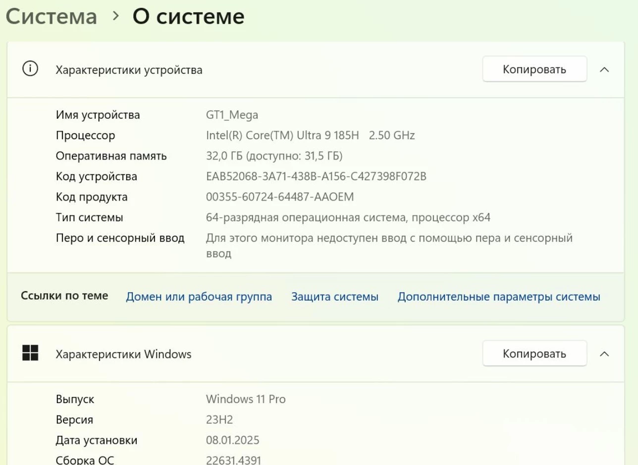 Аппаратная конфигурация включает процессор Intel Core Ultra 9 185H с интегрированным видеоядром Intel Arc Graphics, 32 ГБ оперативной памяти и SSD-накопитель емкостью 2 ТБ.