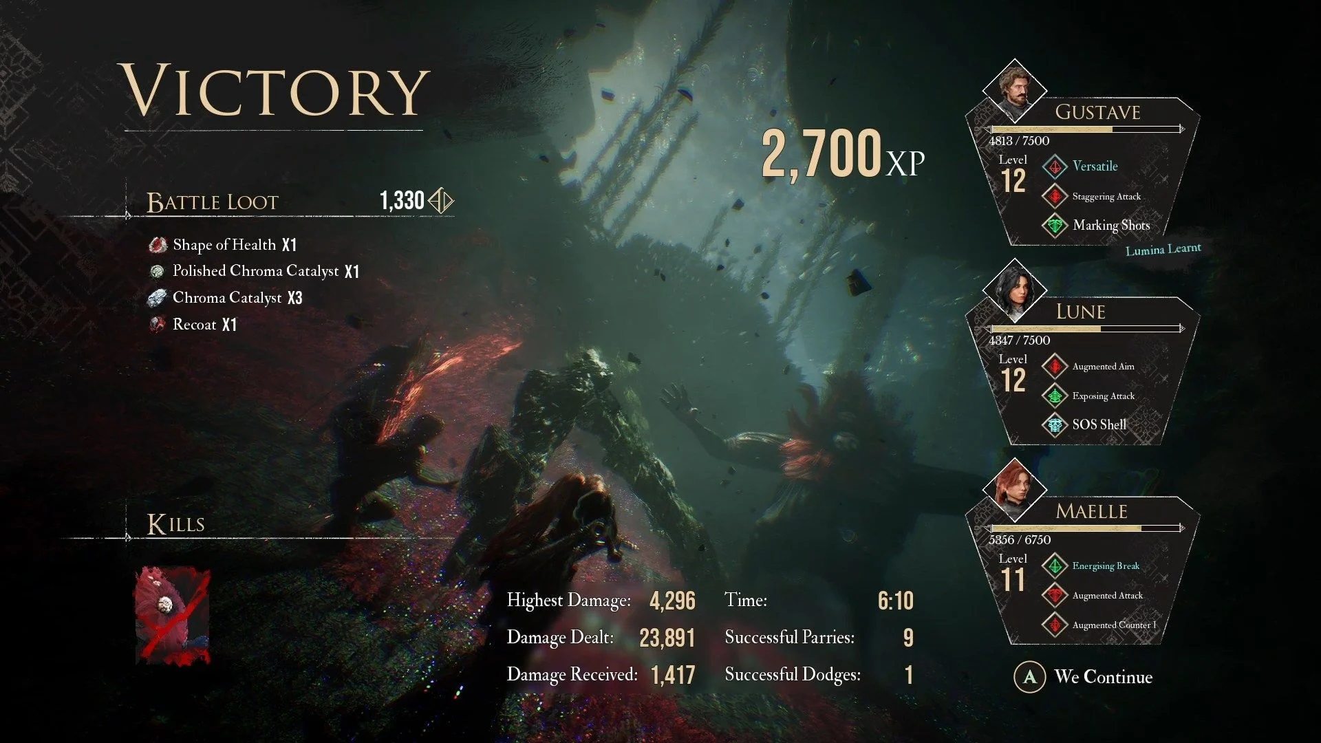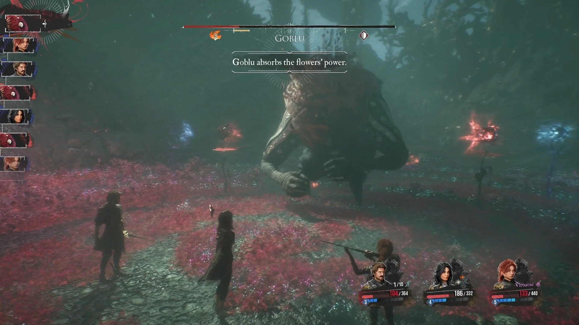 По сравнению с необязательным Буржеоном, которого вы могли встретить раньше, Гоблу – босс с достаточно простой механикой. Он сражается один, не призывает подкрепление и не лишает вас членов команды. Самая опасная атака – это прыжок, так что постарайтесь не пропускать ее, особенно учитывая, что у вас еще нет возможности исцелить всю команду. Не забывайте уничтожать цветы, чтобы босс не стал сильнее. Иногда он будет надевать броню, снести ее можно способностями с несколькими ударами или умением Маэль "Нарушение правил".