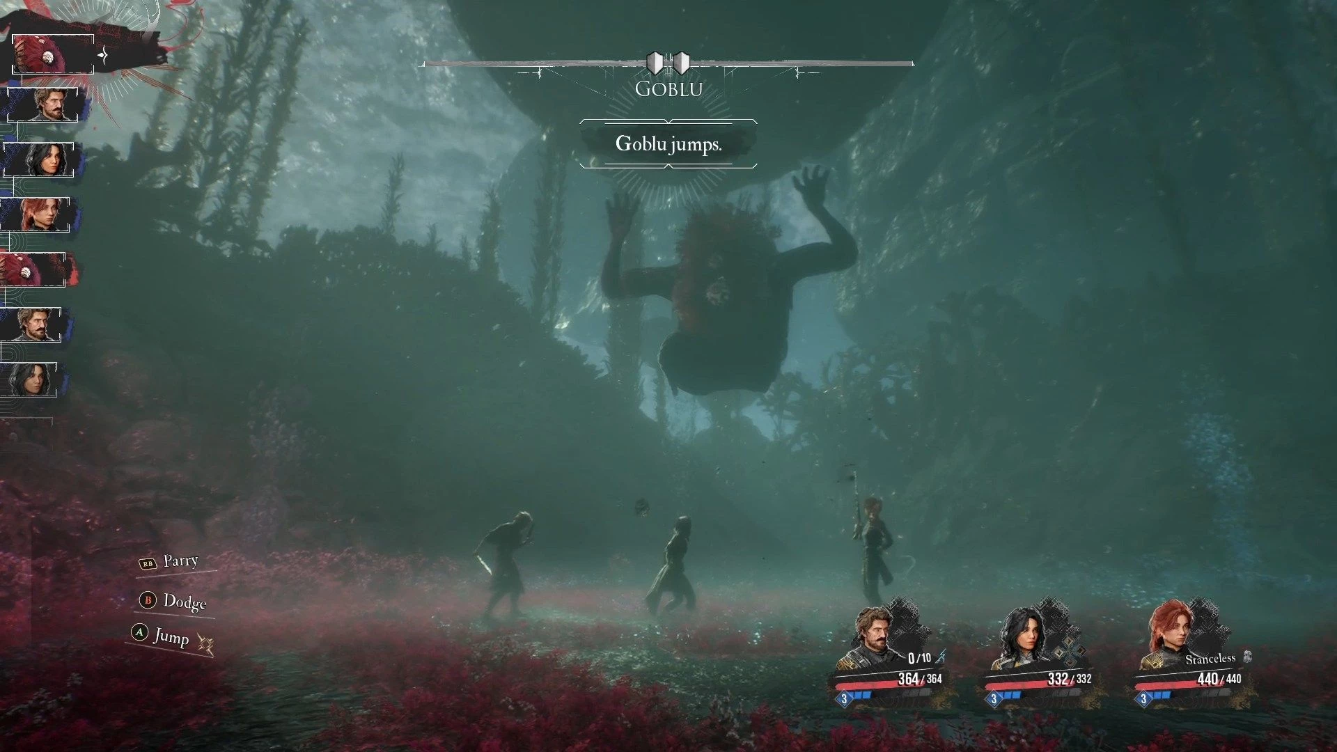 - Прыжок – это массовая атака. Гоблу трижды обрушивается на всю вашу команду, нанося урон при приземлении. Парируйте, но будьте внимательны к третьему прыжку – он немного медленнее предыдущих.