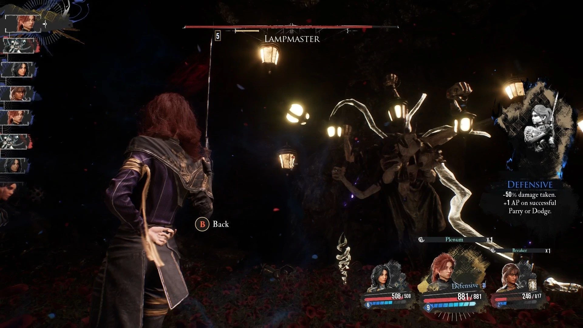 Во второй фазе тебя ждет "Испытание Ламп". Лампы, которые держит босс (левая, правая, верхняя и нижняя), мигают красным в определенном порядке в конце каждого хода босса. Перед его следующим ходом нужно выстрелить во все четыре лампы в той же последовательности (они будут мигать зеленым при попадании). Это может сделать один персонаж или несколько по очереди. Успешно пройдешь испытание – отменишь мощную атаку босса и нанесешь ему кучу урона. Провалитесь – получите серьезный урон от светового меча, который нельзя заблокировать. Важно: каждый успешный выстрел во время испытания вернет AP, потраченные на него.
