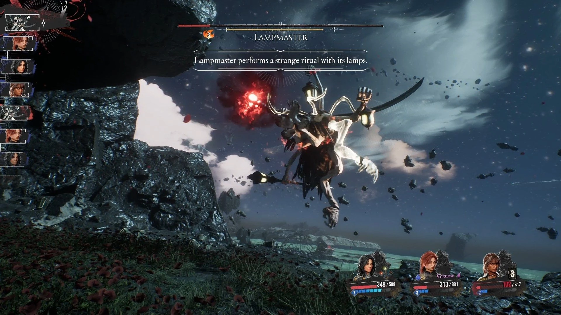 - Выстрелы лампами: Если у него хотя бы одна лампа горит, он в конце хода будет стрелять лучами по случайным членам отряда. Ловите момент, когда снаряды вылетают, и уклоняйтесь. Последний выстрел из последней лампы обычно идет с небольшой задержкой, будьте внимательны. Эту атаку легко парировать, и она дает неплохой приток AP.