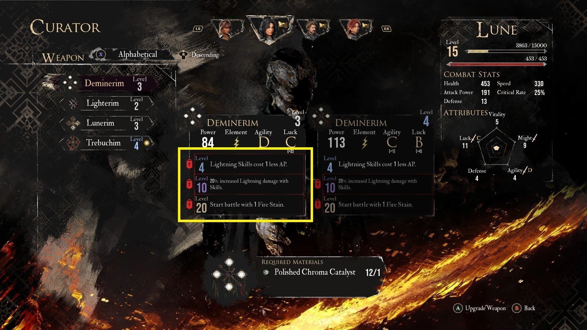 Прокачка оружия увеличивает его силу атаки и масштабирование, что, конечно, делает вас сильнее в бою. Так что не забывайте вовремя улучшать оружие! Особенно, если вы хотите создать крутую комбинацию оружия и характеристик персонажа.
