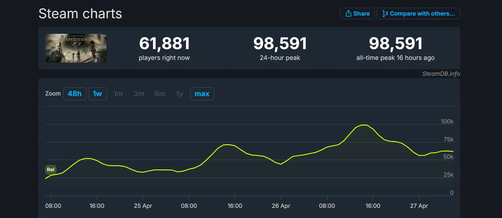 Игра Clair Obscur: Expedition 33, признанная лучшей в 2025 году по версии Metacritic, установила новый рекорд одновременного пребывания игроков в Steam. После запуска проект привлек 50 тысяч пользователей, а вечером 26 апреля количество игроков превысило 98,5 тысяч.
