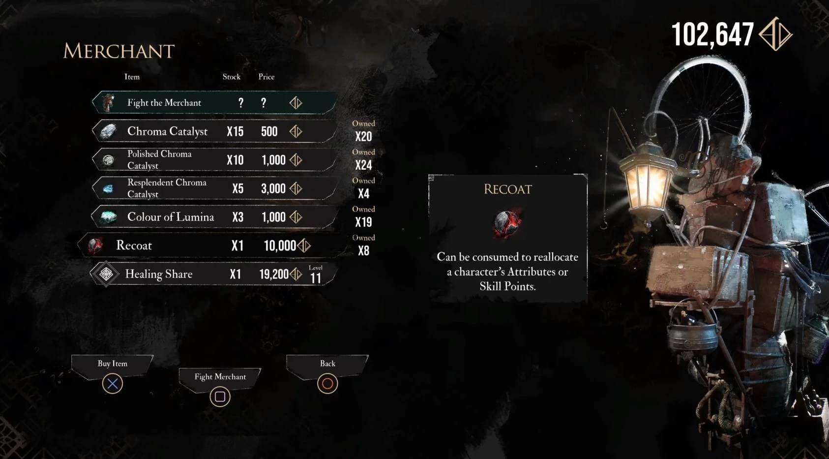 Вы можете в любой момент сбросить и перераспределить очки атрибутов с помощью ретуши в меню улучшений, там же, где вы их тратите. Ретушь встречается нечасто: ее можно получить за победу над боссами, решение головоломок, приобрести у торговцев из Жестры, а также найти при исследовании мира.