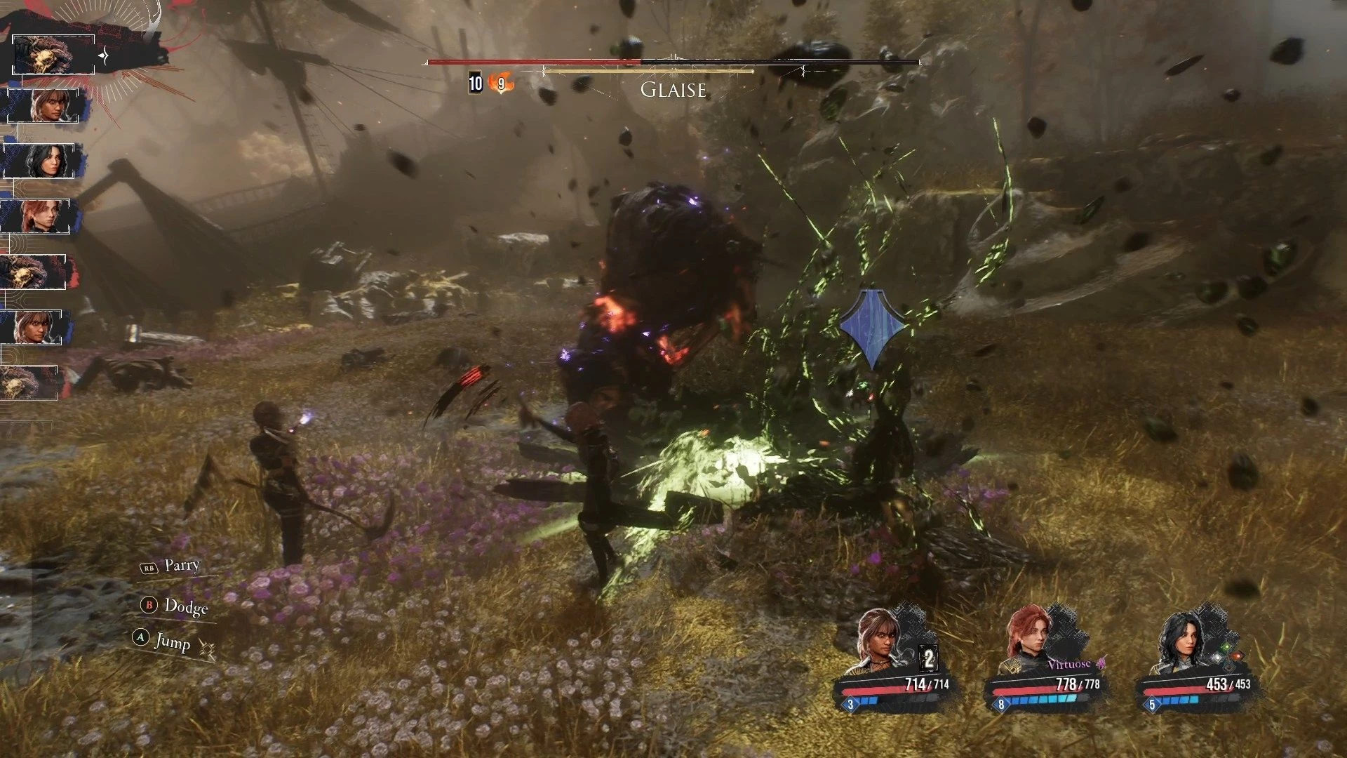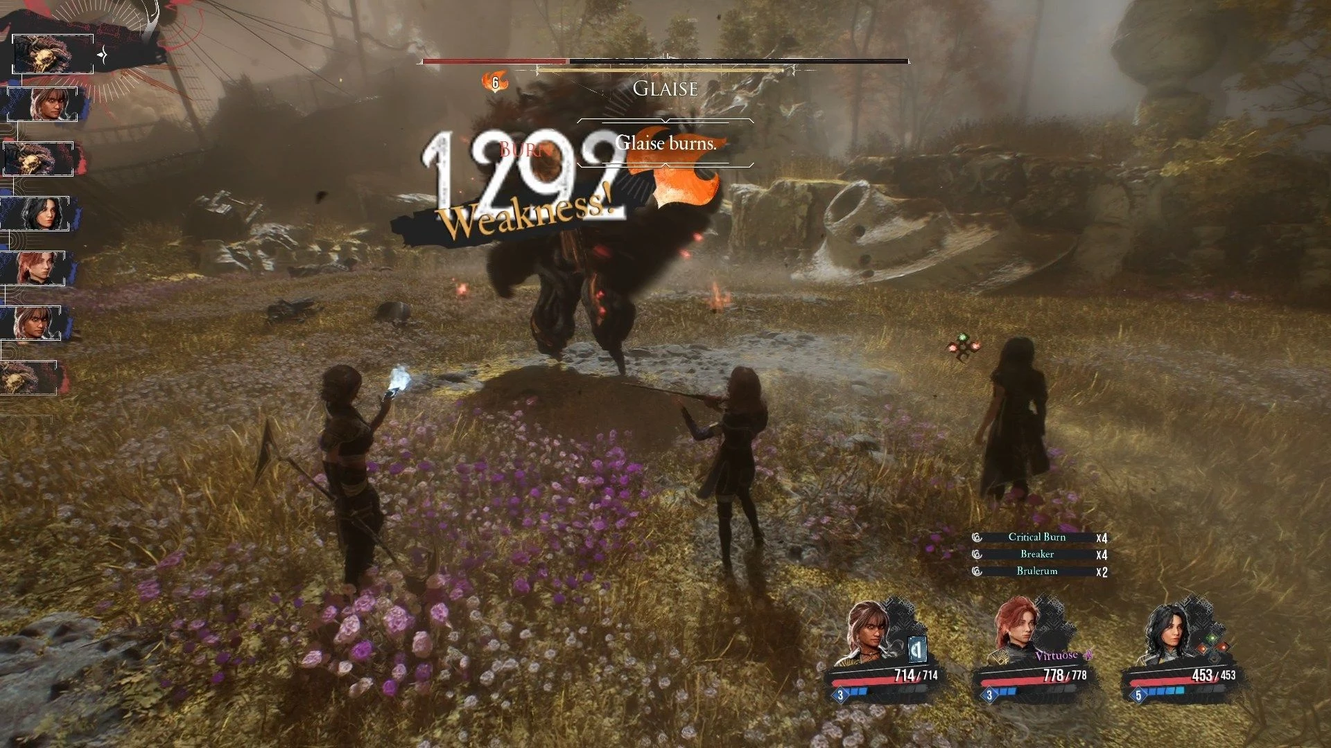 В бою с Глейзом нет какой-то супер-сложной тактики – он просто использует эти две атаки всё время. Он очень боится огня, а вот землю наоборот – поглощает. В начале боя у него три очка брони, которые надо снести. И старайся не ловить его удары – хоть их и легко парировать, они наносят очень много урона всей команде. Так что главное – выучить его атаки наизусть, это сильно поможет. А ещё, раз он так не любит огонь, навыки поджигания очень пригодятся.