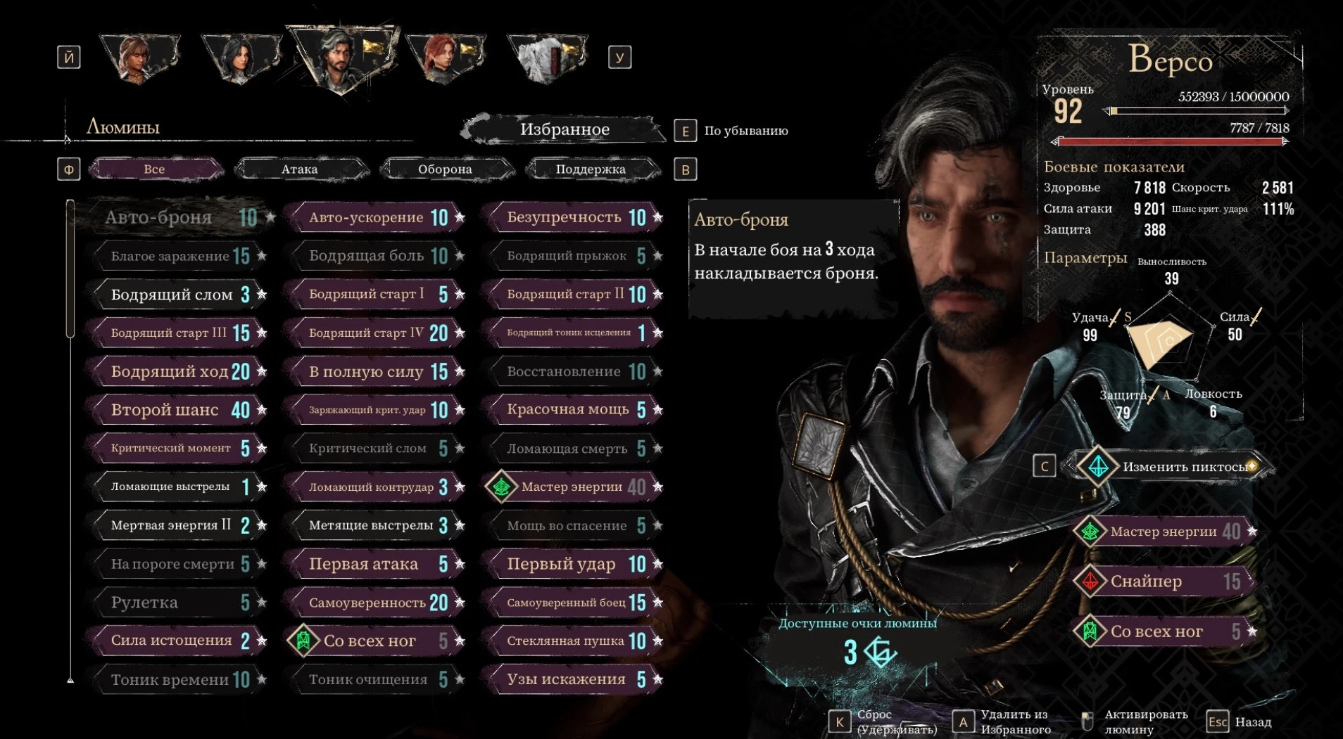 Важно помнить: использование люмины для активации разблокированных бонусов дает персонажу Экспедиции лишь особые умения, а не те усиления характеристик, которые изначально предоставляются пиктосами. Необходимо тщательно взвешивать, что выбрать: слот пиктоса ради его бонуса и характеристик или очки люмины, если хотите оставить слоты свободными для других пиктосов. Баланс здесь играет ключевую роль. Например, если пиктос обладает уникальной способностью (вроде воскрешения с полным здоровьем раз за бой, как у пиктоса «Второй шанс»), её стоит установить одному персонажу через пиктос, а другим активировать за очки люмины, что обойдется в 40 очков!