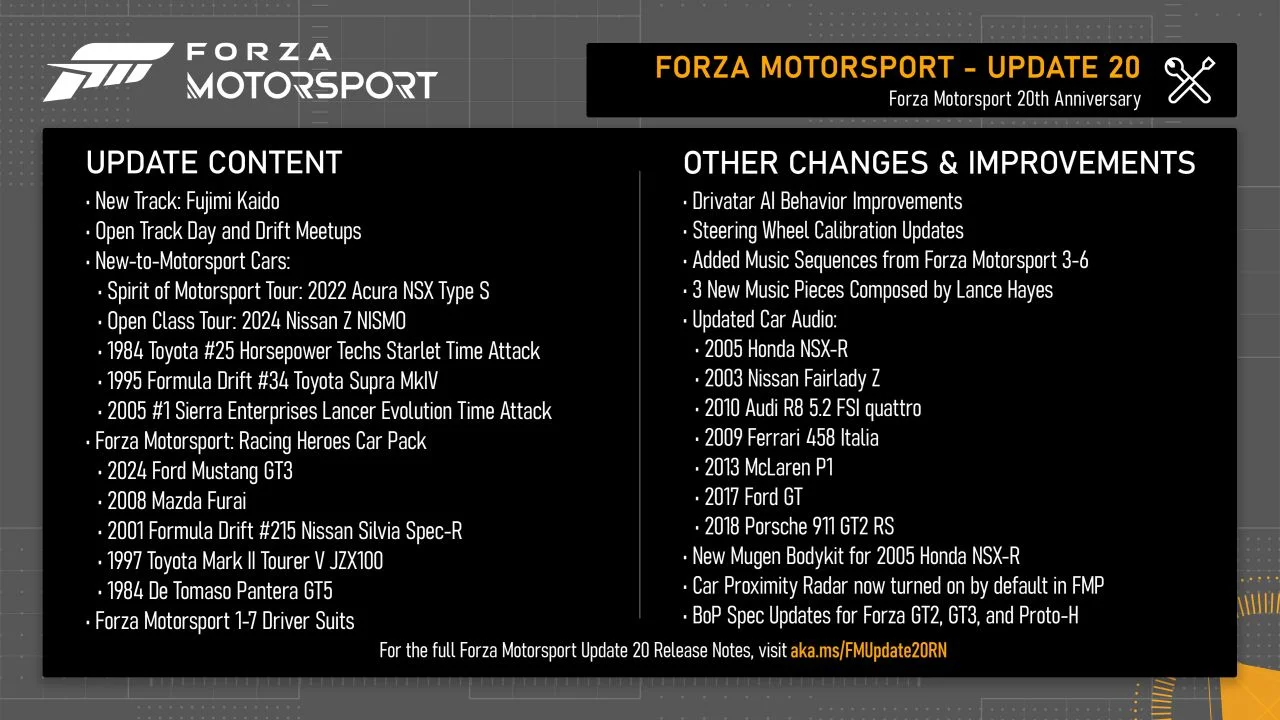 К двадцатилетнему юбилею серии Forza Motorsport студия Turn 10 выпустила юбилейное, двадцатое обновление для гоночного симулятора, включающее в себя множество нововведений.