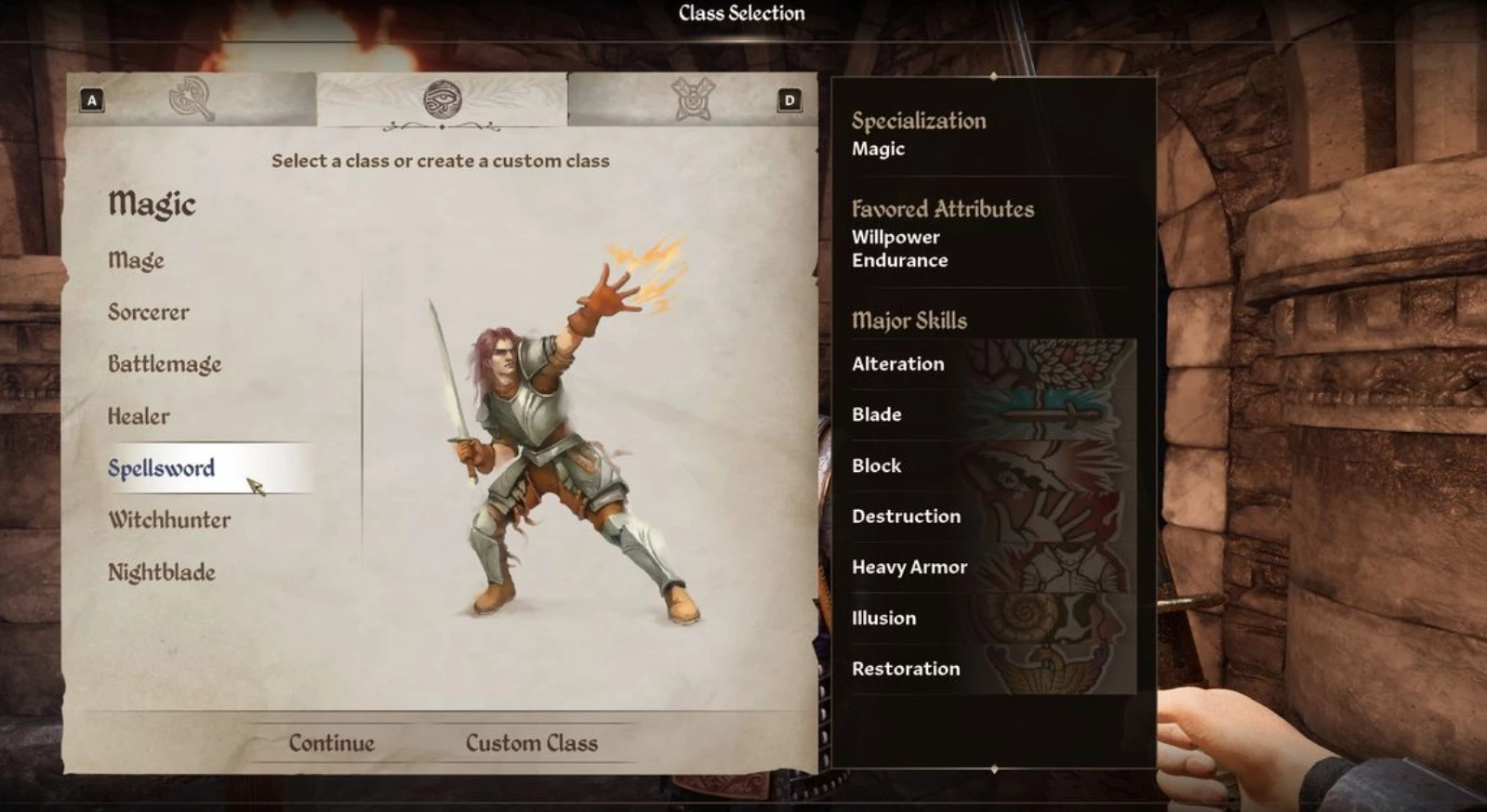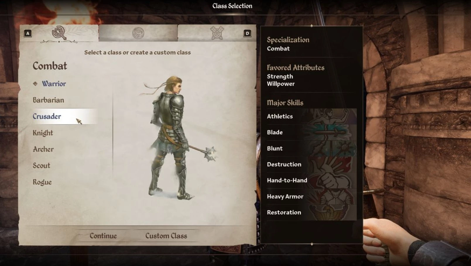 - Воин: Делает упор на силу и выносливость. Навыки: владение тяжёлой бронёй, атлетика, фехтование, блокирование ударов, использование дробящего оружия, рукопашный бой, ремонт брони.