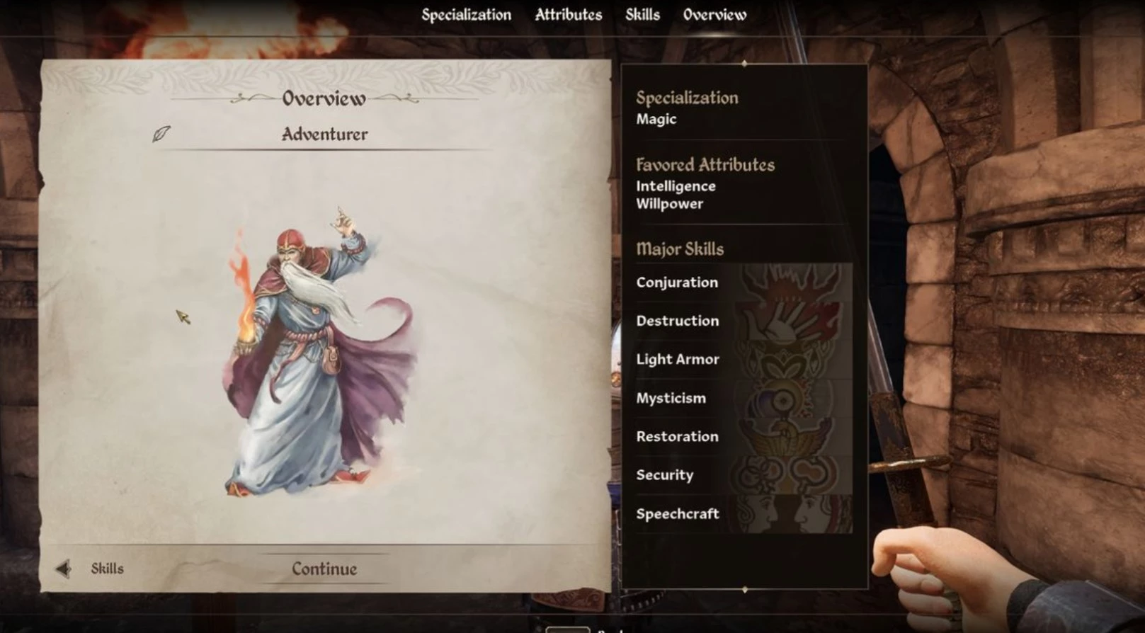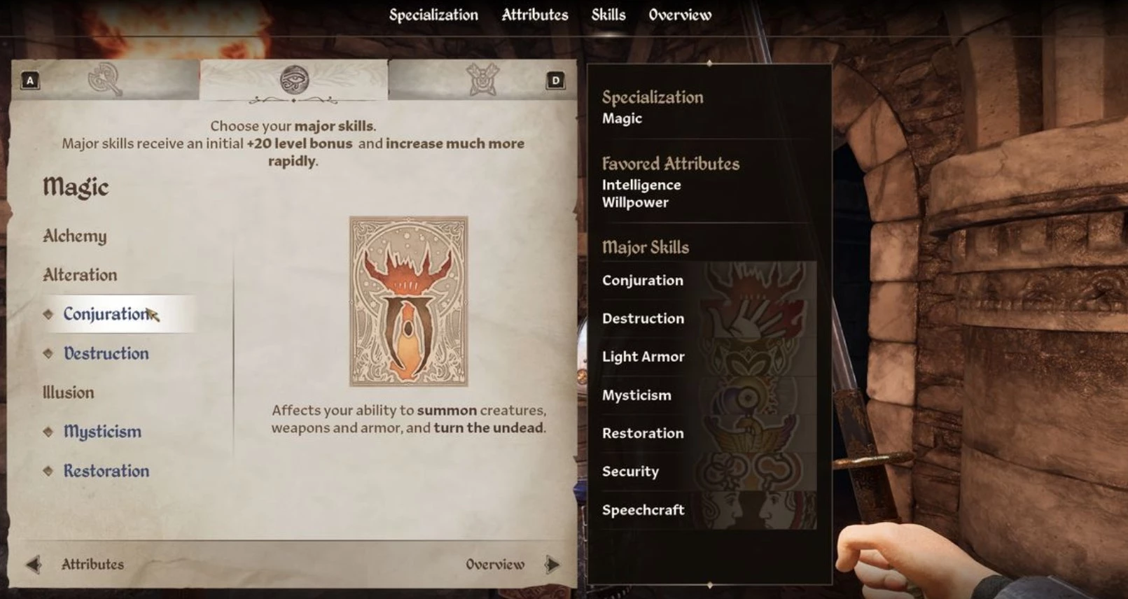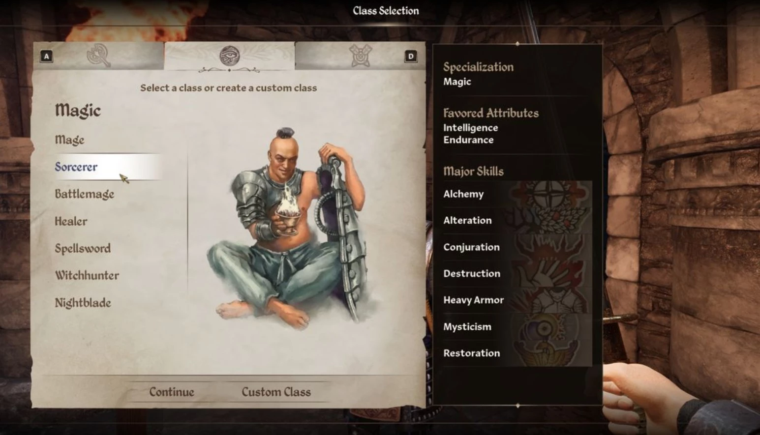- Колдун: Сочетает интеллект и выносливость. Навыки: алхимия, трансформация, призыв, разрушение, ношение тяжёлой брони, мистицизм, восстановление.
