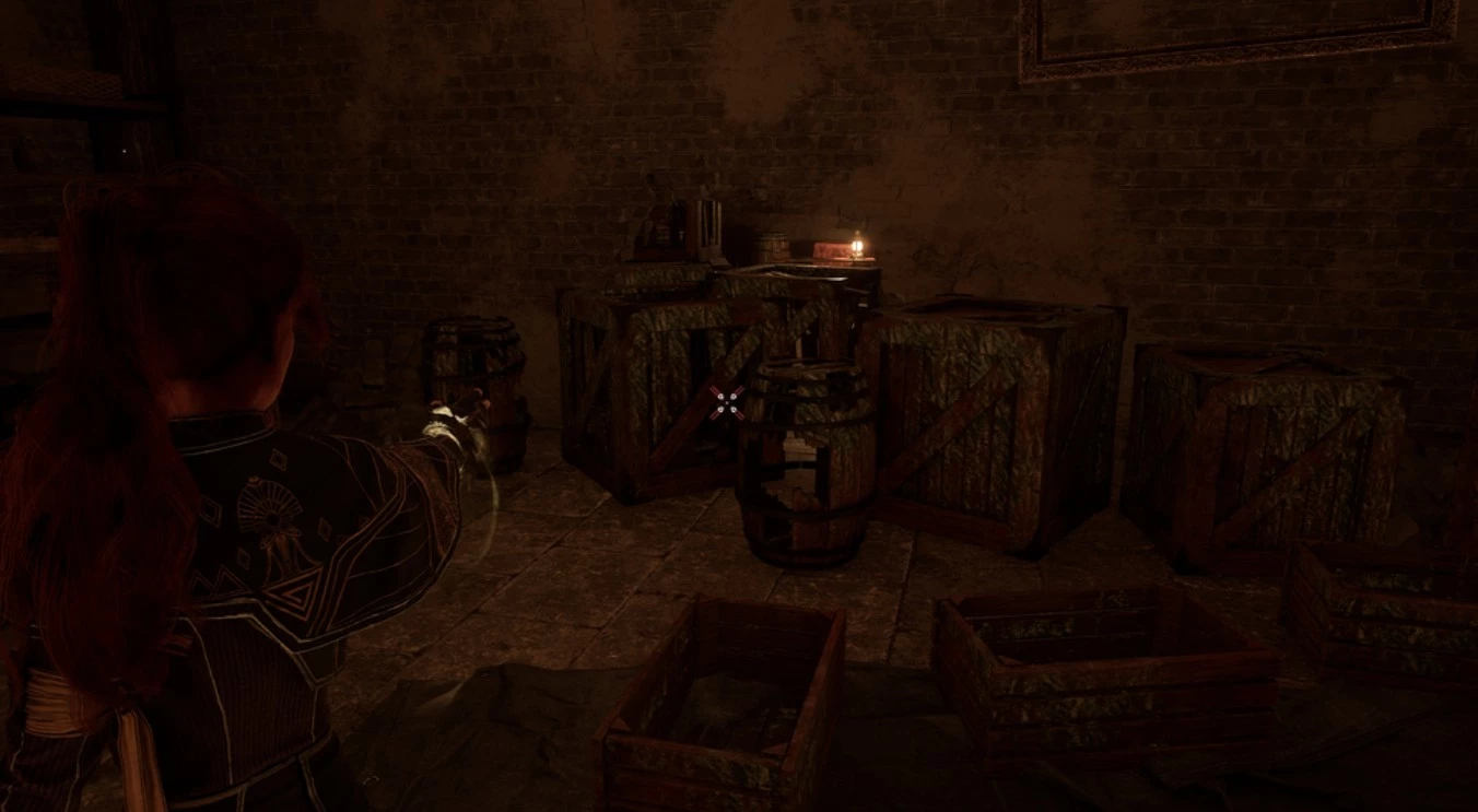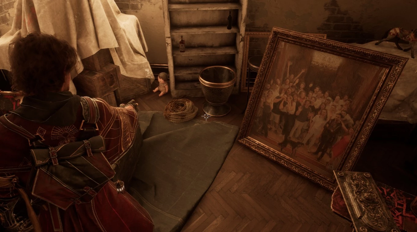 Разрушив деревянные ящики у стены, используя свободный прицел или удар, вы сможете пройти вглубь подвала, подняться по лестнице и открыть дверь в кладовую. На правой стене, рядом с книжным шкафом, будет висеть та самая картина. Присмотревшись, вы увидите в нижней части изображение собаки по кличке Моноко — настоящего питомца команды Sandfall Interactive.