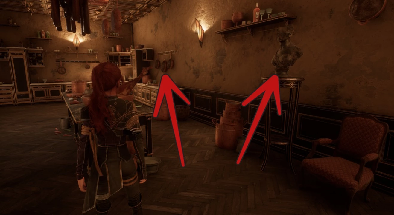 Войдя внутрь, вам предстоит решить головоломку на кухне, чтобы продвинуться дальше. Для этого необходимо повернуть несколько предметов: сковороду, висящую на стене, меньший из двух подсвечников на столе и статуэтку возле стены. После этого откроется проход в полу рядом с напольными часами. Этот пролом ведет в подвал.