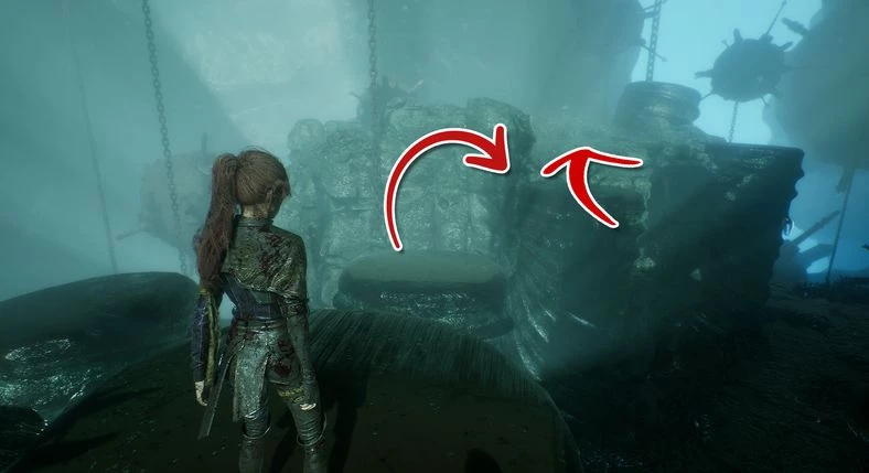После исследования Особняка и знакомства с Ноко, идите по северо-западному коридору, сразу за флагом «Хижина Ноко». Пройдя немного вперед, вы окажетесь на просторной площадке с брюлерами, люстерами, деминерами и затонувшим судном Экспедиции 68. Вместо прохода через пробоину в корабле (охраняется брюлером), идите к северной окраине. Там вы увидите большое круглое отверстие.