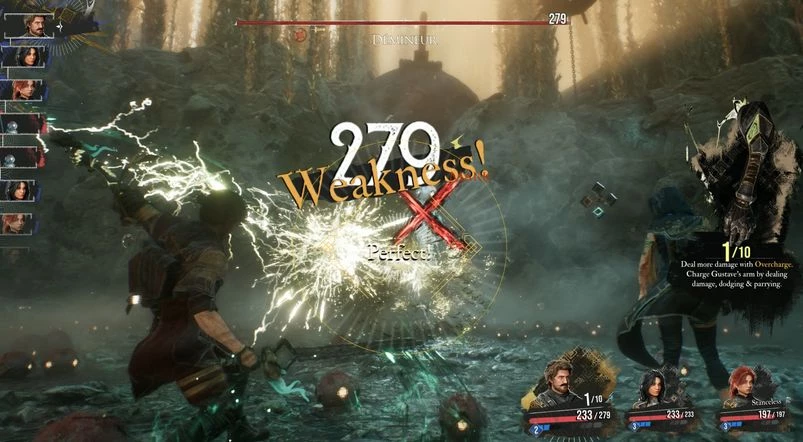 Деминер может использовать и вторую атаку, размахивая миной, но лучше этого не допускать. Эффективным решением будет стрельба по мине (обычными прицельными выстрелами), что требует всего 1 ОД. Воспользуйтесь уязвимостью Деминера к электрическому урону, применяя умения Гюстава «Метка» и «Разряд», а также «Громовой удар» и «Электризацию» Люнэ.
