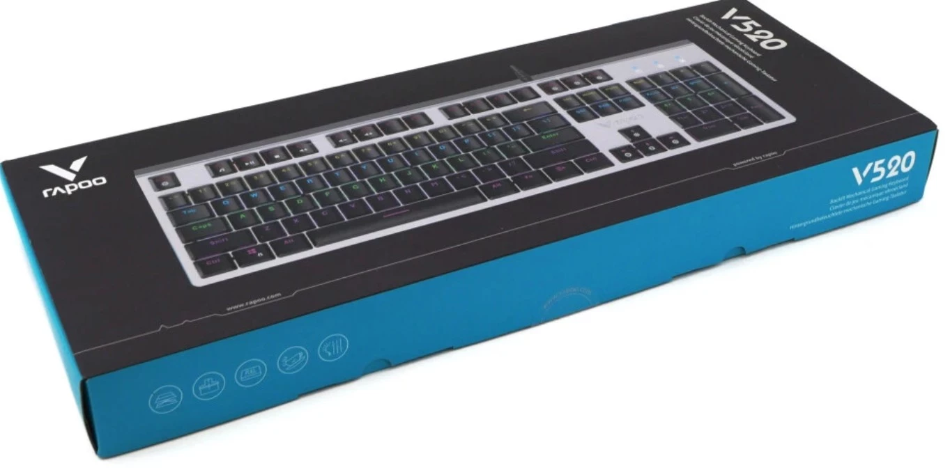 Rapoo V520 поставляется в фирменной коробке, характерной для большинства устройств этого бренда: преобладающий черный цвет, крупное изображение продукта на лицевой стороне, дополненное логотипом компании и названием модели, а также акценты сине-бирюзового оттенка по бокам.