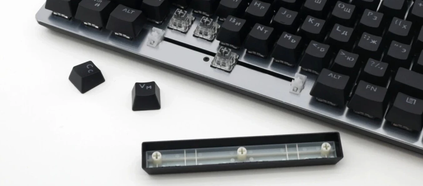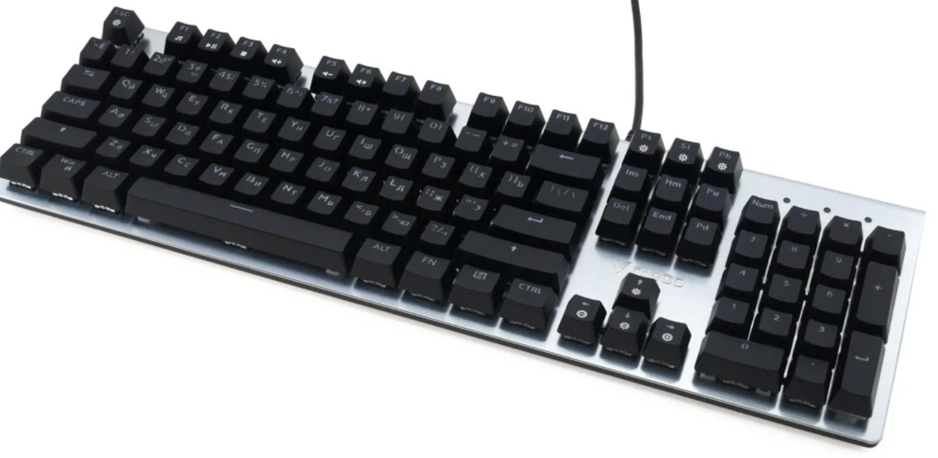 Кейкапы классического профиля и черного цвета, изготовленные из ABS-пластика методом двойного литья, гарантируют долговечность символов, хотя без подсветки их видимость несколько снижается. Символы легко различимы, несмотря на некоторое отличие их начертания от привычного. Присутствует русская раскладка. Для доступа к дополнительным функциям предусмотрена клавиша Fn, предлагающая стандартный набор опций, включая управление мультимедиа и подсветкой, подробно описанных в руководстве.